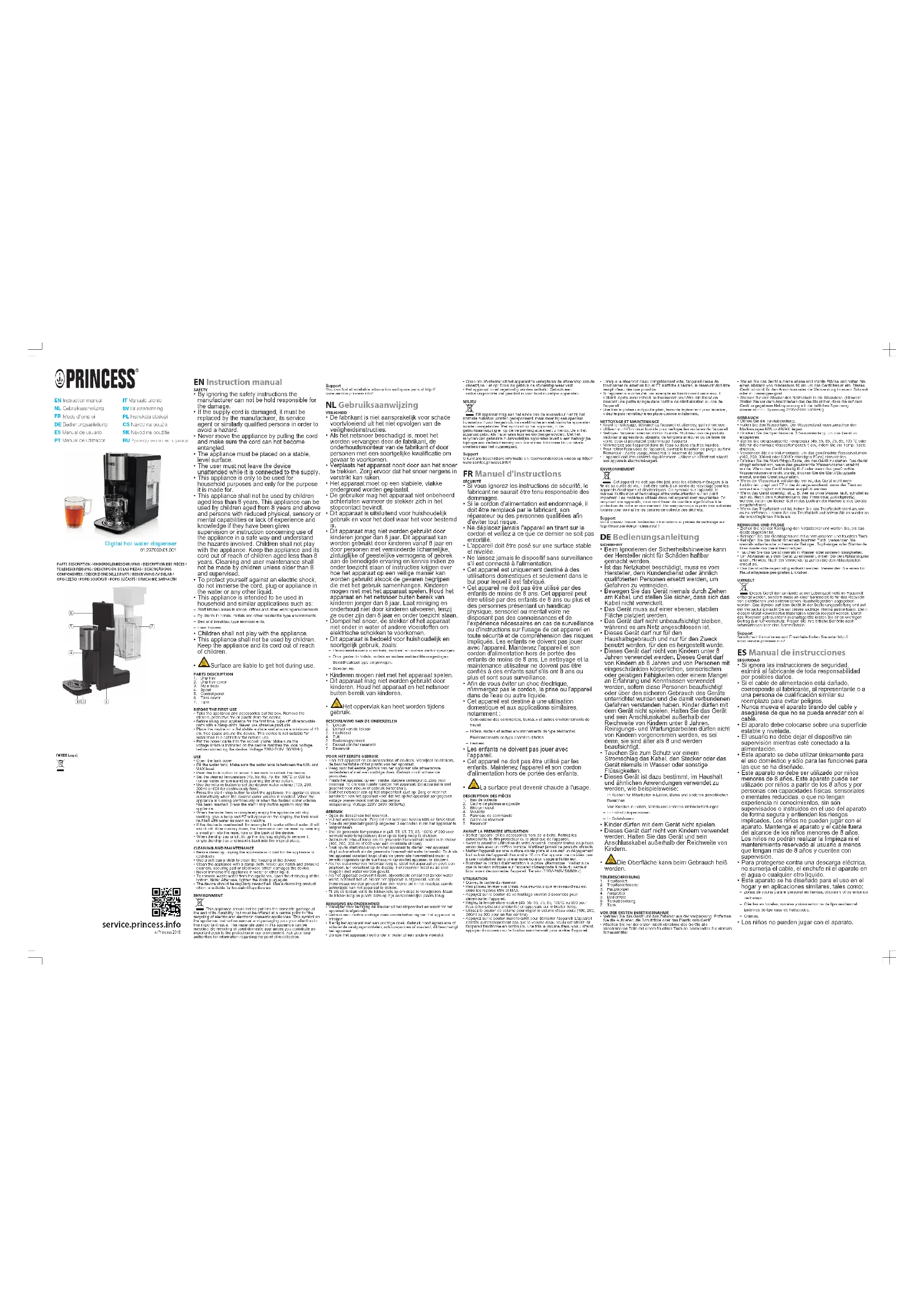 - L'appareil doit être détartré régulièrement. Utilisez un détartrant adapté aux appareils électroménagers. ENVIRONNEMENT Cet appareil ne doit pas être jeté avec les déchets ménagers à la fin de sa durée de vie, il doit être remis à un centre de recyclage pour les appareils électriques et électroniques. Ce symbole sur l'appareil, le manuel d'utilisation et l'emballage attire votre attention sur un point important. Les matériaux utilisés dans cet appareil sont recyclables. En recyclant vos appareils, vous contribuez de manière significative à la protection de notre environnement. Renseignez-vous auprès des autorités locales pour connaître les centres de collecte des déchets. Support Vous pouvez trouver toutes les informations et pièces de rechange sur http://www.service.princess.info/! DEBedienungsanleitung SICHERHEIT
