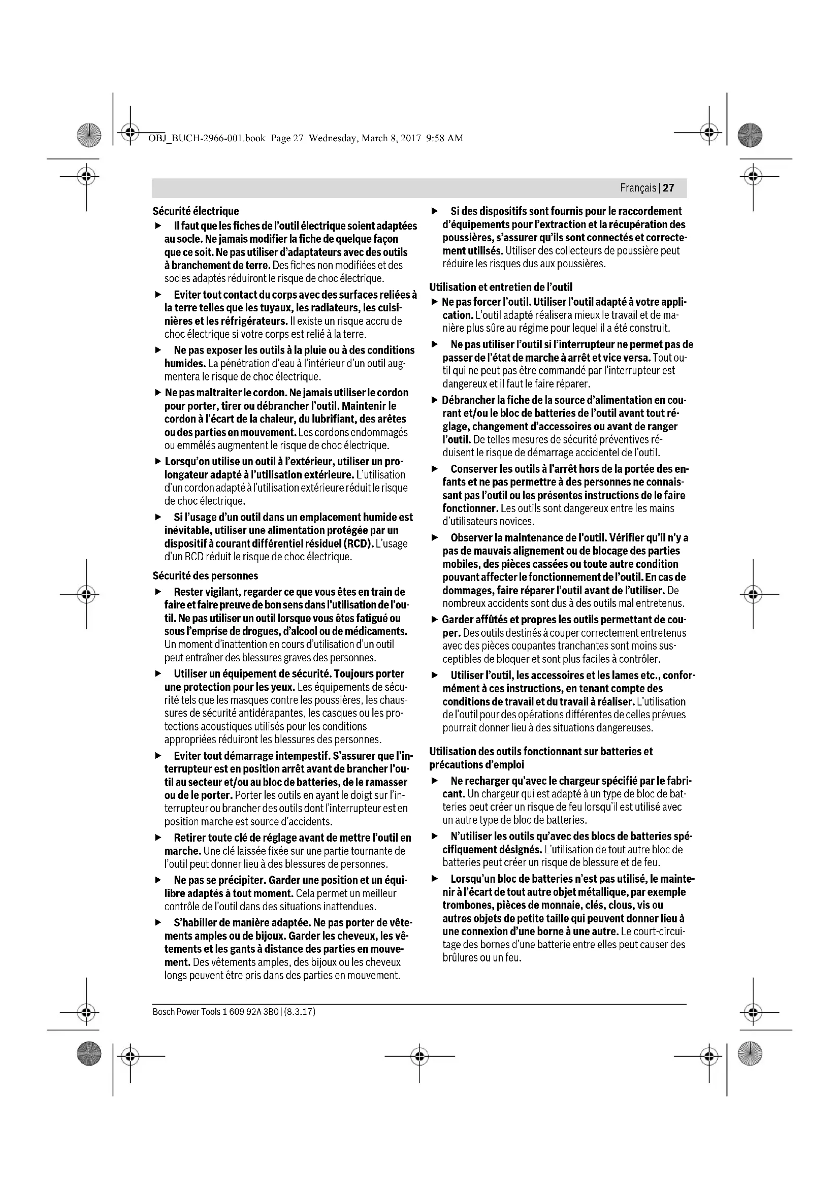 ant de monter la feuille abrasive 14 afin d’obtenir une adhésion optimale. Placez la feuille abrasive 14 de façon à la faire coïncider avec un bord du plateau de ponçage 13 et appuyez sur la feuille abrasive par un léger mouvement de rotation dans le sens des aiguilles d’une montre. Afin de garantir une bonne aspiration de poussières, assurez- vous que les trous perforés de la feuille abrasive et du plateau de ponçage coïncident. Pour retirer la feuille abrasive 14, prenez-la par un coin et re- tirez-la du plateau de ponçage 13. Il est possible d’utiliser toutes les lames de scie ou feutres de polissage et de nettoyage de la série Delta 93 mm du pro- gramme d’accessoires Bosch. Montez les accessoires de ponçage tels que les non-tissé ou les feutres à polir de la même manière sur le plateau de pon- çage. Lame de scie à plongée bimétal bois et métal Bois, Matériaux en bois abra- sifs, Plastiques, Clous et vis trempés, Tuyaux en métaux non ferreux Coupes plongeantes rapides et profondes dans des maté- riaux en bois abrasifs et dans des plastiques Exemple : découpe rapide de tubes en métaux non ferreux et de profilés de petites dimensions, découpe facile de clous et vis non trempés et de profilés en acier de petites dimensions Lame de scie à plongée HCS bois Bois tendre, Tourillons, Tétons, Eléments de mobilier Découpes et coupes plongeantes rapides et profondes ; aussi pour le sciage à ras dans les coins et dans les endroits difficiles d’accès Exemple : coupes plongeantes profondes dans du bois tendre pour l’encastrement d’une grille d’aération Outil de travail Matériau Utilisation OBJ_BUCH-2966-001.book Page 33 Wednesday, March 8, 2017 9:58 AM34 | Français 1 609 92A 3B0 | (8.3.17) Bosch Power Tools Choix de la feuille abrasive En fonction du matériau à travailler et du travail demandé, il existe différentes feuilles abrasives : Aspiration de poussières/de copeaux Les poussières de matériaux tels que peintures contenant du plomb, certains bois, minéraux ou métaux, peuvent être nuisibles à la santé. Entrer en contact ou aspirer les pous- sières peut entraîner des réactions allergiques et/ou des maladies respiratoires auprès de l’utilisateur ou de per- sonnes se trouvant à proximité. Certaines poussières telles que les poussières de chêne ou de hêtre sont considérées comme cancérigènes, surtout en association avec des additifs pour le traitement du bois (chromate, lazure). Les matériaux contenant de l’amiante ne doivent être travaillés que par des personnes qualifiées. – Si possible, utilisez un dispositif d’aspiration des pous- sières approprié au matériau. – Veillez à bien aérer la zone de travail. – Il est recommandé de porter un masque respiratoire avec un niveau de filtration de classe P2. Respectez les règlements spécifiques aux matériaux à trai- ter en vigueur dans votre pays. Evitez toute accumulation de poussières à l’emplace- ment de travail. Les poussières peuvent facilement s’en- flammer. Raccordement de l’aspiration des poussières (acces- soires en option) Le dispositif d’aspiration 20 n’est conçu que pour les travaux avec le plateau de ponçage 13, il ne peut pas être utilisé avec d’autres outils de travail. Utilisez toujours une aspiration des poussières pour les tra- vaux de ponçage. Pour monter le dispositif d’aspiration de poussières 20 (acces- soire), retirez l’outil de travail et la butée de profondeur 15. Glissez jusqu’en butée le dispositif d’aspiration des pous- sières 20 sur le collet de l’outil électroportatif, par dessus le porte-outil 10. Faites pivoter le dispositif d’aspiration des poussières dans la position souhaitée (pas directement sous l’outil électroportatif). Refermez le levier de serrage 21 pour fixer le dispositif d’aspiration des poussières. Emboîter le manchon du tuyau d’aspiration 18 sur le raccord d’aspiration des poussières 19. Raccorder l’autre extrémité du tuyau d’aspiration 18 à un aspirateur (non fourni). Vous trouverez un tableau pour le raccordement aux diffé- rents aspirateurs sur la pages des graphiques. L’aspirateur doit être approprié au matériau à travailler. Pour l’aspiration de poussières particulièrement nuisibles à la santé, cancérigènes ou sèches, utilisez des aspirateurs spéci- fiques. Mise en marche Mise en service Montage de l’accu Note : L’utilisation d’accus non appropriés pour votre outil électroportatif peut entraîner des dysfonctionnements ou en- dommager l’outil électroportatif. Introduisez l’accu chargé 4 par l’arrière dans le pied de l’outil électroportatif. Enfoncez complètement l’accu dans le pied jusqu’à ce que le trait rouge ne soit plus visible et que l’accu soit bien verrouillé. Mise en Marche/Arrêt Pour mettre en marche l’outil électroportatif, poussez l’inter- rupteur Marche/Arrêt 2 vers l’avant de sorte que «I» appa- raisse sur l’interrupteur. Le démarrage électronique en douceur limite le couple lors de la mise en marche et augmente la durée de vie du moteur. Le constant-électronic permet de maintenir presque constante la vitesse en marche à vide et en charge, et assure ainsi une performance régulière. Feuille abrasive Matériau Utilisation Grains Qualité rouge – Tous les bois (p.ex. bois dur, bois tendre, panneaux agglomérés, panneaux muraux) – Matériaux en métal Pour le dégrossissage p. ex. de poutres et planches rugueuses, non rabotées grossier 40