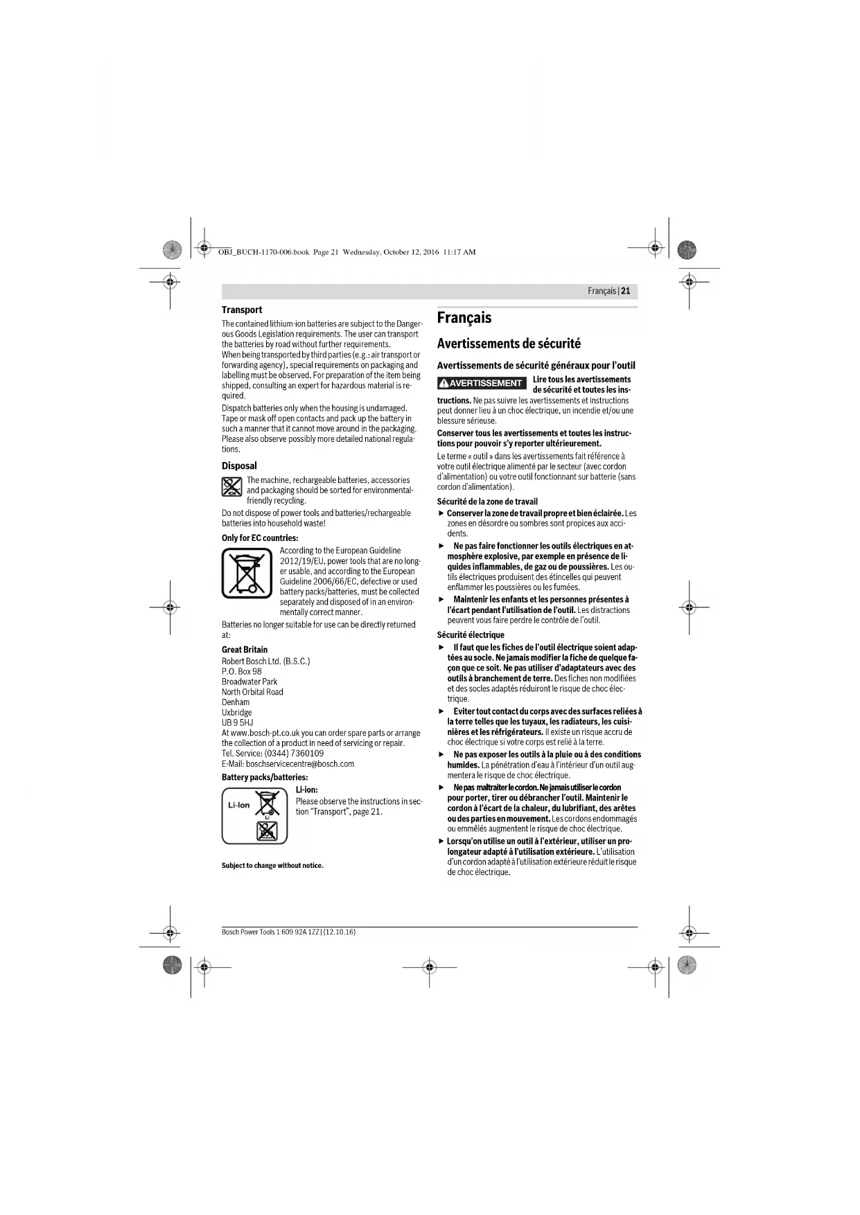 Le niveau d’oscillation indiqué dans ces instructions d’utilisa- tion a été mesuré conformément à la norme EN 60745 et peut être utilisé pour une comparaison d’outils électroportatifs. Il est également approprié pour une estimation préliminaire de la charge vibratoire. Le niveau d’oscillation correspond aux utilisations principales de l’outil électroportatif. Si l’outil électrique est néanmoins utilisé pour d’autres applications, avec différents accessoires ou d’autres outils de travail ou s’il est mal entretenu, le niveau d’oscillation peut être différent. Ceci peut augmenter consi- dérablement la charge vibratoire pendant toute la durée de travail. Pour une estimation précise de la charge vibratoire, il est re- commandé de prendre aussi en considération les périodes pendant lesquelles l’appareil est éteint ou en fonctionnement, mais pas vraiment utilisé. Ceci peut réduire considérable- ment la charge vibratoire pendant toute la durée de travail. Déterminez des mesures de protection supplémentaires pour protéger l’utilisateur des effets des vibrations, telles que par exemple : Entretien de l’outil électrique et des outils de tra- vail, maintenir les mains chaudes, organisation des opéra- tions de travail. Déclaration de conformité Nous déclarons sous notre propre responsabilité que le pro- duit décrit sous « Caractéristiques techniques » est en confor- mité avec toutes les dispositions des directives 2011/65/UE, 2014/30/UE, 2006/42/CE et leurs modifications ainsi qu’avec les normes suivantes : EN 60745-1, EN 60745-2-4, EN 50581. Dossier technique (2006/42/CE) auprès de : Robert Bosch Power Tools GmbH, PT/ECS, 70538 Stuttgart, GERMANY Robert Bosch Power Tools GmbH 70538 Stuttgart, GERMANY Stuttgart, 01.01.2017 Montage Chargement de l’accu N’utilisez que les chargeurs indiqués sur la page des ac- cessoires. Seuls ces chargeurs sont adaptés à l’accu à ions lithium utilisé dans votre outil électroportatif. Note : L’accu est fourni en état de charge faible. Afin de garan- tir la puissance complète de l’accu, chargez complètement l’accu dans le chargeur avant la première mise en service. La batterie Lithium-ion peut être rechargée à tout moment, sans que sa durée de vie n’en soit réduite. Le fait d’inter- rompre le processus de charge n’endommage pas la batterie. Retirer l’accu Pour sortir l’accu 2, appuyez sur la touche de déverrouillage 1 et sortez l’accu à l’arrière de l’outil électroportatif. Ne pas for- cer. Voyant lumineux indiquant l’état de charge de l’accu Quand l’outil électroportatif est en marche, le voyant lumi- neux indiquant l’état de charge de l’accu 4 indique la capacité d’accu encore disponible ou une surcharge. Si le voyant lumineux indiquant l’état de charge de l’accu 4 cli- gnote rouge, c’est que l’outil électroportatif est soumis à une surcharge. Veuillez respecter les indications données dans le chapitre « Protection contre une surcharge en fonction de la température », page 28. Outil multi-fonction PMF 10,8 LI N° d’article 3 603 A01 9.. Présélection de la vitesse