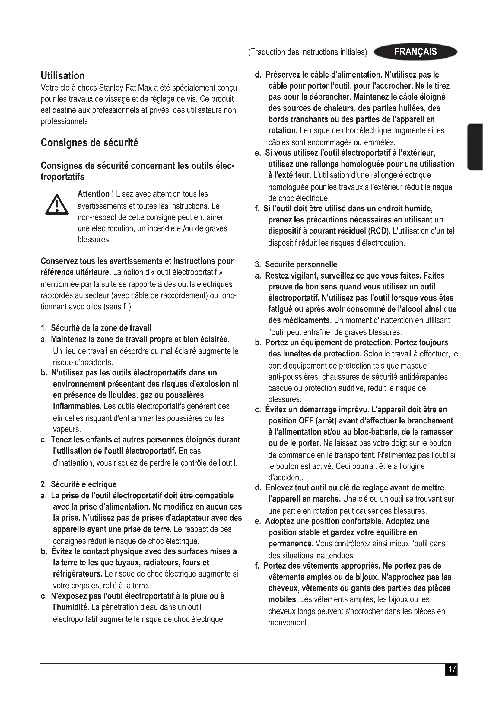 Si un produit Stanley Fat Max s'avère défectueux en raison de matériaux en mauvais état ou d'une erreur humaine dans les 12 mois suivant la date d'achat, Stanley Europe garantit le remplacement gratuit ou – à sa discrétion - des pièces défectueuses si : u Le produit a été correctement utilisé et a été utilisé en respectant les instructions du manuel. u L'usure du produit est normale ; u Les réparations ont été effectuées par des personnes agréées ; u Une preuve d'achat est donnée ; u Le produit Stanley Fat Max est réexpédié avec tous les composants d'origine. Pour toutes réclamations, recherchez l'adresse du réparateur agréé Stanley le plus proche de chez vous dans le catalogue Fat Max ou contactez le bureau local Stanley à l'adresse in- diquée dans ce manuel. Une liste de réparateurs agréés Fat Max et de plus amples détails sur notre service après-vente sont disponibles sur le site Internet www.stanley.eu/324 (Traduzione del testo originale) ITALIANO Uso previsto L’avvitatore/chiave battente Stanley Fat Max è stato proget- tato per avvitare e per applicazioni di taratura dei dadi. Questo strumento è destinato a professionisti e private, gli utenti non professionali. Istruzioni di sicurezza Avvisi di sicurezza generici per gli elettroutensili
