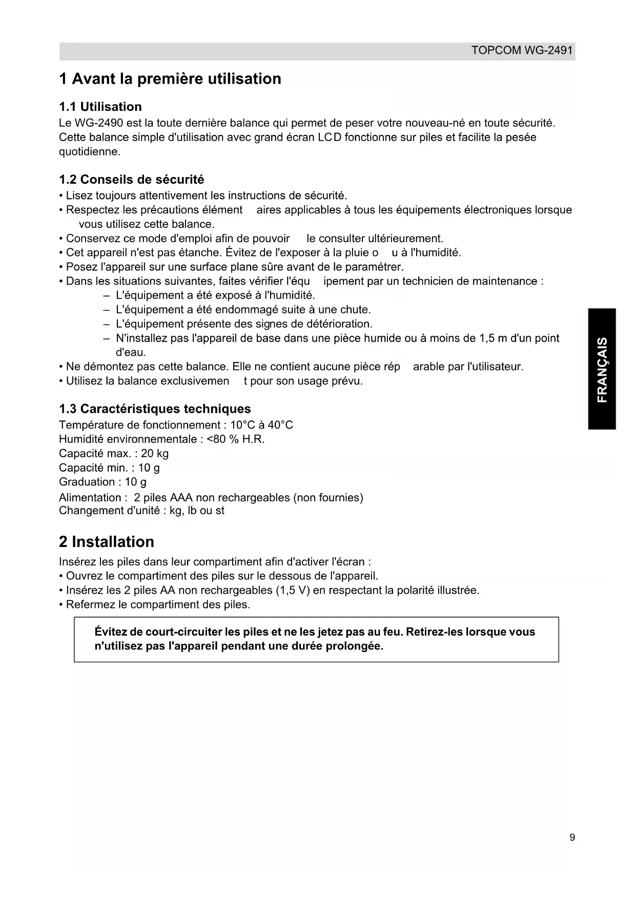 O-Ld Batterie faible - Remplacer les piles Surcharge. Le poids du bébé excède 20 kg. 6 Nettoyage Nettoyez le plateau à l'aide d'un chiffon légèrement humide ou antistatique. N'utilisez jamais de détergents ou de solvants abrasifs. 7 Mise au rebut de l'appareil (environnement) Au terme du cycle de vie de ce produit, ne le jetez pas avec les déchets ménagers ordinaires mais déposez-le dans un point de collecte p our le recyclage des équipements électriques et électroniques. Le symbole indiqué sur ce produit, sur le mode d'emploi et/ou sur la boîte est là pour vous le rappeler.11 FRANÇAIS TOPCOM WG-2491 Certains matériaux qui composent le produit peuvent être réutilisés s'ils sont déposés dans un point de recyclage. En réutilisant certaines pièces ou matières premières de produits usagés, vous contribuez fortement à la protection de l'environnement. Pour toute information supplémentaire sur les points de collecte dans votre région, contactez les autorités locales. Avant de jeter l'appareil, retirez les piles. Éliminez les piles de manière écologique, selon les réglementations en vigueur dans votre pays. 8 Garantie Topcom