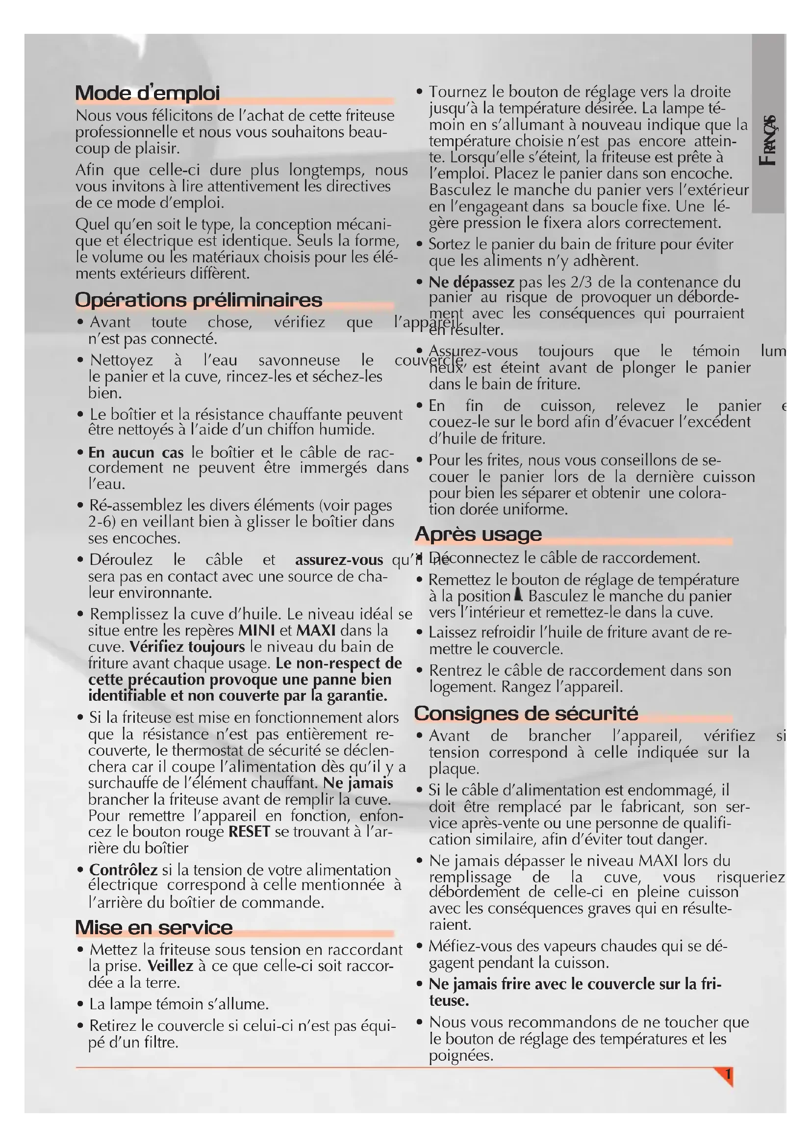 - Vériez le niveau de la cuve avant son em- ploi, trop d’huile ou de graisse provoque un dé- bordement - pas assez empêche la cuisson.