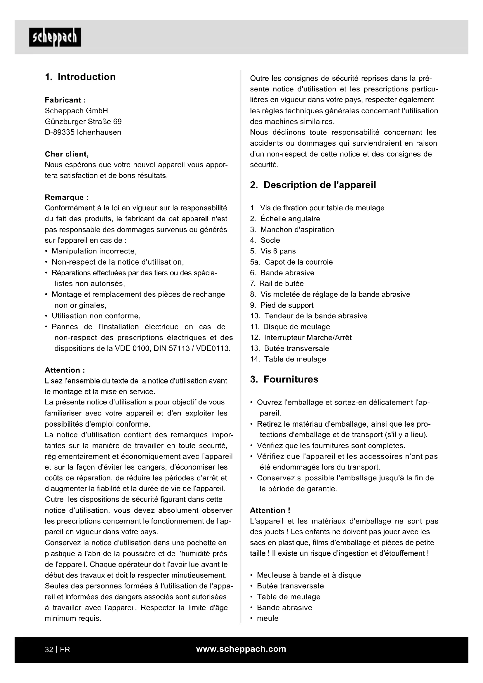 Fabricant : Scheppach GmbH Günzburger Straße 69 D-89335 Ichenhausen Cher client, Nous espérons que votre nouvel appareil vous appor- tera satisfaction et de bons résultats. Remarque : Conformément à la loi en vigueur sur la responsabilité du fait des produits, le fabricant de cet appareil n'est pas responsable des dommages survenus ou générés sur l'appareil en cas de :