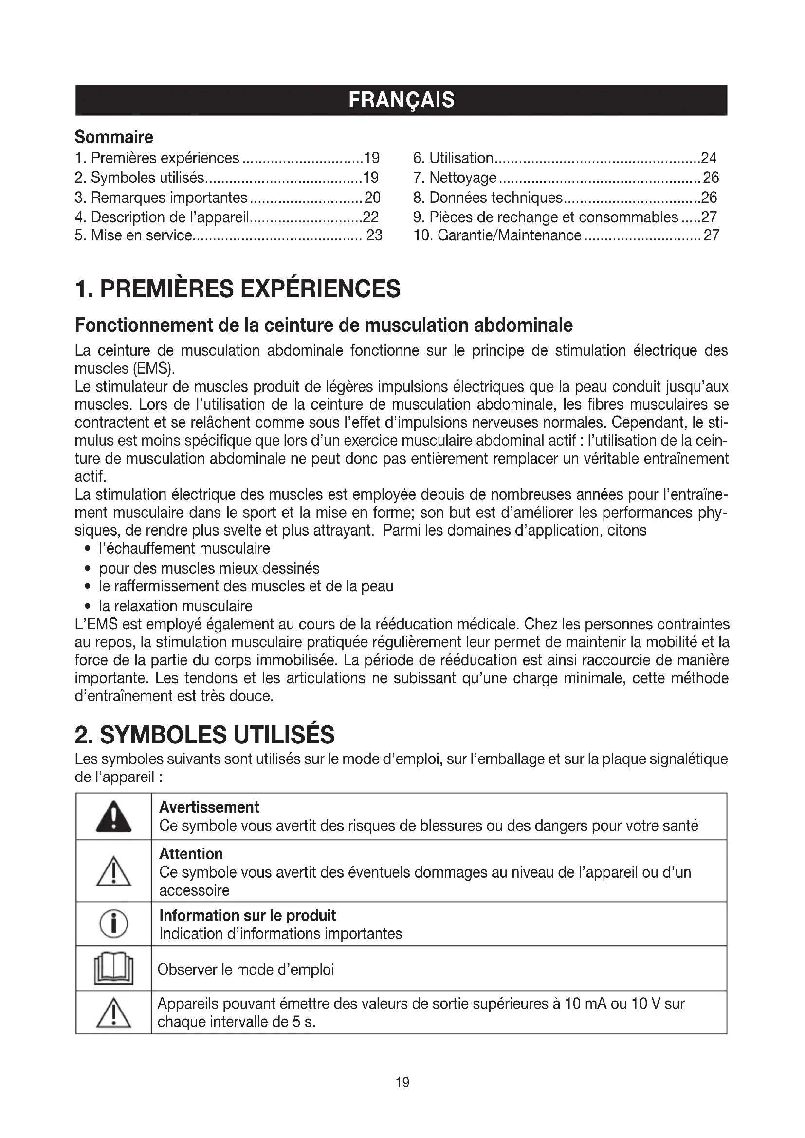 Les symboles suivants sont utilisés sur le mode d’emploi, sur l’emballage et sur la plaque signalétique de l’appareil: Avertissement Ce symbole vous avertit des risques de blessures ou des dangers pour votre santé Attention Ce symbole vous avertit des éventuels dommages au niveau de l’appareil ou d’un accessoire Information sur le produit Indication d’informations importantes Observer le mode d’emploi Appareils pouvant émettre des valeurs de sortie supérieures à 10mA ou 10V sur chaque intervalle de 5s. FRANÇAIS Sommaire