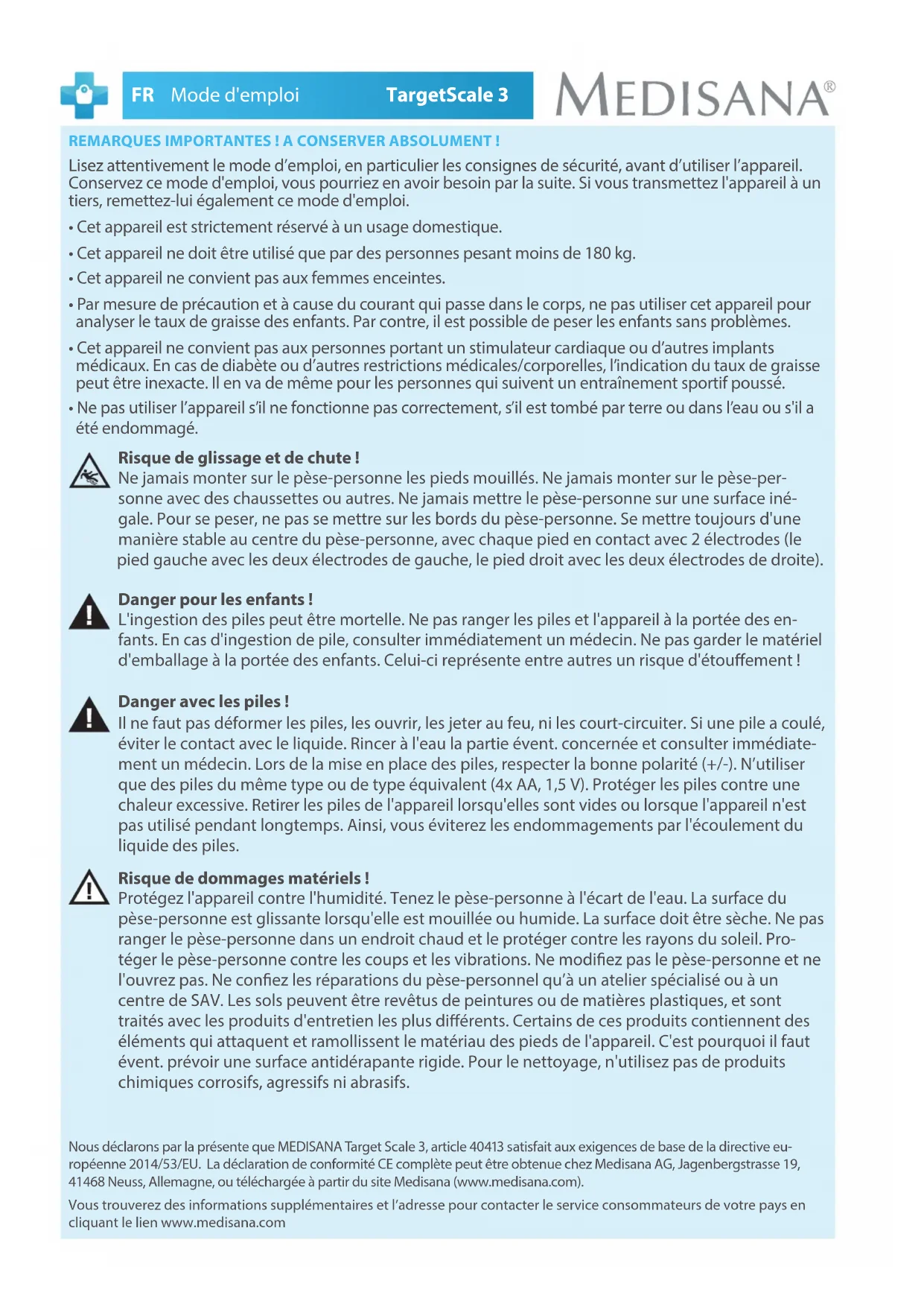 - Ne pas utiliser l’appareil s’il ne fonctionne pas correctement, s’il est tombé par terre ou dans l’eau ou s'il a été endommagé. Risque de glissage et de chute ! Ne jamais monter sur le pèse-personne les pieds mouillés. Ne jamais monter sur le pèse-per- sonne avec des chaussettes ou autres. Ne jamais mettre le pèse-personne sur une surface iné- gale. Pour se peser, ne pas se mettre sur les bords du pèse-personne. Se mettre toujours d'une manière stable au centre du pèse-personne, avec chaque pied en contact avec 2 électrodes (le pied gauche avec les deux électrodes de gauche, le pied droit avec les deux électrodes de droite). Danger pour les enfants ! L'ingestion des piles peut être mortelle. Ne pas ranger les piles et l'appareil à la portée des en- fants. En cas d'ingestion de pile, consulter immédiatement un médecin. Ne pas garder le matériel d'emballage à la portée des enfants. Celui-ci représente entre autres un risque d'étouement ! Danger avec les piles ! Il ne faut pas déformer les piles, les ouvrir, les jeter au feu, ni les court-circuiter. Si une pile a coulé, éviter le contact avec le liquide. Rincer à l'eau la partie évent. concernée et consulter immédiate- ment un médecin. Lors de la mise en place des piles, respecter la bonne polarité (+/-). N’utiliser que des piles du même type ou de type équivalent (4x AA, 1,5 V). Protéger les piles contre une chaleur excessive. Retirer les piles de l'appareil lorsqu'elles sont vides ou lorsque l'appareil n'est pas utilisé pendant longtemps. Ainsi, vous éviterez les endommagements par l'écoulement du liquide des piles. Risque de dommages matériels ! Protégez l'appareil contre l'humidité. Tenez le pèse-personne à l'écart de l'eau. La surface du pèse-personne est glissante lorsqu'elle est mouillée ou humide. La surface doit être sèche. Ne pas ranger le pèse-personne dans un endroit chaud et le protéger contre les rayons du soleil. Pro- téger le pèse-personne contre les coups et les vibrations. Ne modiez pas le pèse-personne et ne l'ouvrez pas. Ne conez les réparations du pèse-personnel qu’à un atelier spécialisé ou à un centre de SAV. Les sols peuvent être revêtus de peintures ou de matières plastiques, et sont traités avec les produits d'entretien les plus diérents. Certains de ces produits contiennent des éléments qui attaquent et ramollissent le matériau des pieds de l'appareil. C'est pourquoi il faut évent. prévoir une surface antidérapante rigide. Pour le nettoyage, n'utilisez pas de produits chimiques corrosifs, agressifs ni abrasifs. Nous déclarons par la présente que MEDISANA Target Scale 3, article 40413 satisfait aux exigences de base de la directive eu- ropéenne 2014/53/EU. La déclaration de conformité CE complète peut être obtenue chez Medisana AG, Jagenbergstrasse 19, 41468 Neuss, Allemagne, ou téléchargée à partir du site Medisana (www.medisana.com). Vous trouverez des informations supplémentaires et l’adresse pour contacter le service consommateurs de votre pays en cliquant le lien www.medisana.com FR Mode d'emploi TargetScale 311 TargetScale 3 Mode d'emploi FR B) Réglage des données personnelles sur le pèse-personne / Mesure du poids avec fonction d’analyse Le pèse-personne peut enregistrer les données (sexe, mode athlète, taille, âge) de 8 personnes avec jusqu'à 30 emplacements de mémoire. Les valeurs préréglées sur le pèse-personne sont : Homme, 165 cm, 30 ans, kg.