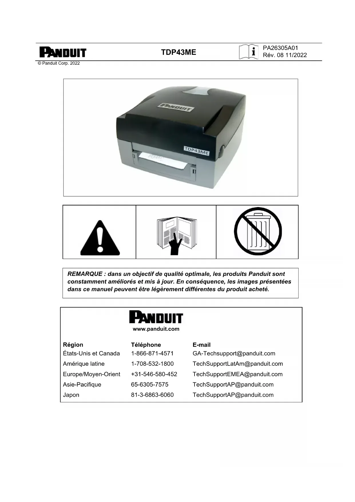 www.panduit.com Région Téléphone E-mail États-Unis et Canada 1-866-871-4571 GA-Techsupport@panduit.com Amérique latine 1-708-532-1800 TechSupportLatAm@panduit.com Europe/Moyen-Orient +31-546-580-452 TechSupportEMEA@panduit.com Asie-Pacifique 65-6305-7575 TechSupportAP@panduit.com Japon 81-3-6863-6060 TechSupportAP@panduit.comTDP43ME