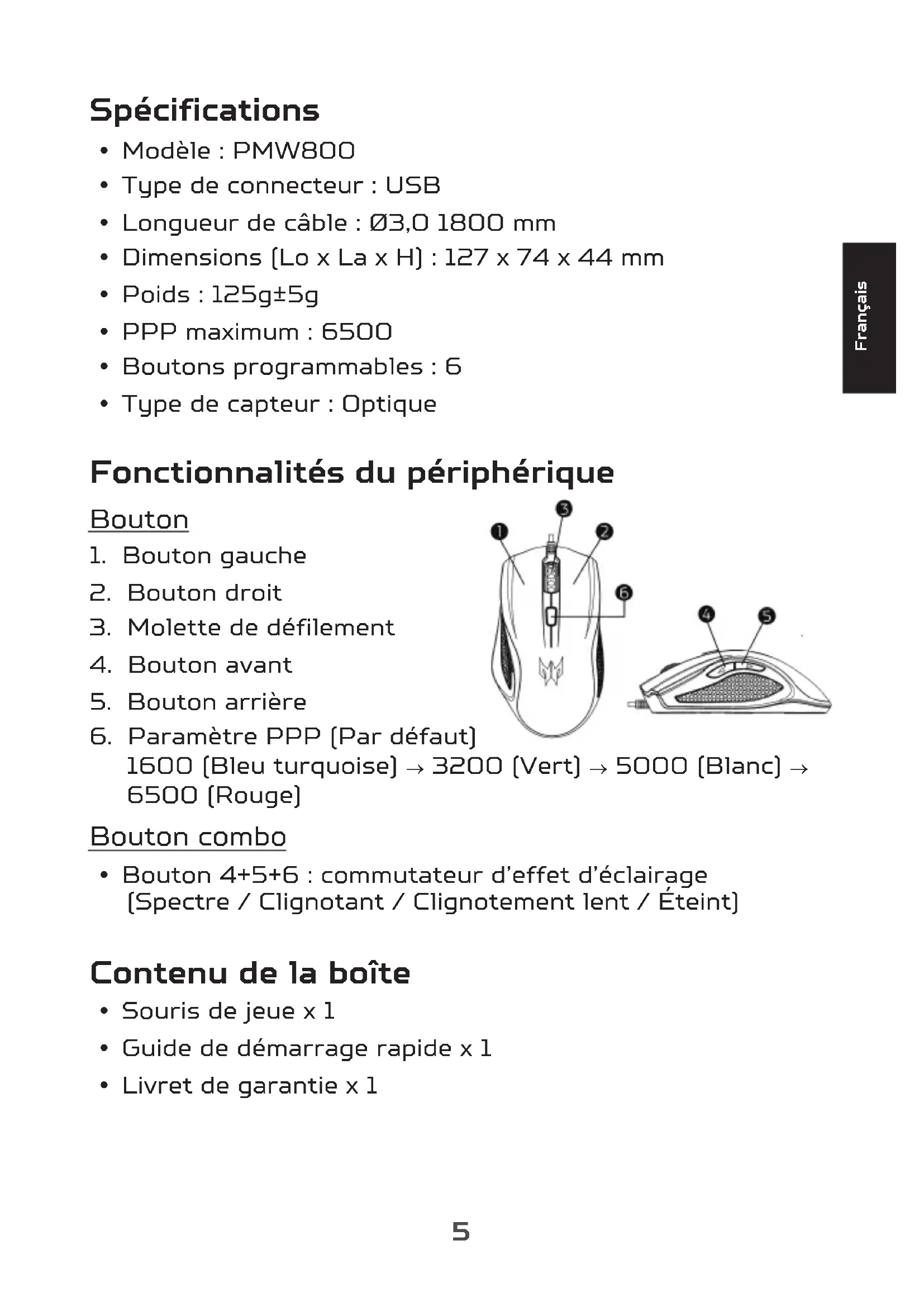 | Caractéristiques techniques | Souris optique, capteur PMW800, résolution jusqu'à 8000 DPI, 5 niveaux de DPI réglables |