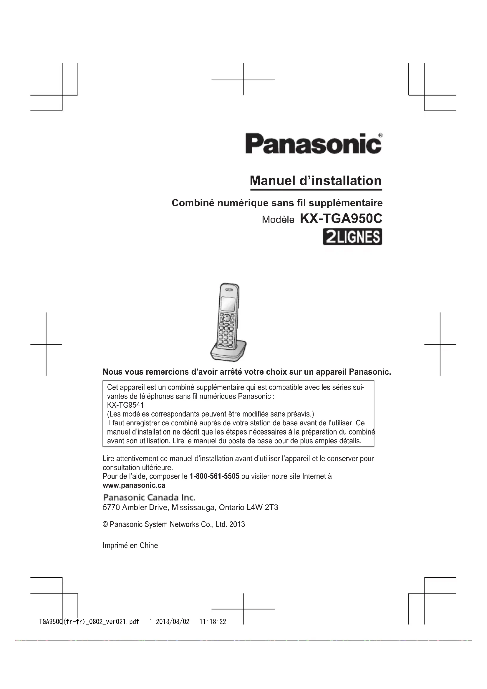 Installation TGA950C(en)_0716_ver011.pdf 9 2013/07/16 12:26:1410 Notes TGA950C(en)_0716_ver011.pdf 10 2013/07/16 12:26:14Modèle KX-TGA950C Manuel d’installation Combiné numérique sans fil supplémentaire Nous vous remercions d’avoir arrêté votre choix sur un appareil Panasonic. Cet appareil est un combiné supplémentaire qui est compatible avec les séries sui-vantes de téléphones sans fil numériques Panasonic :KX-TG9541(Les modèles correspondants peuvent être modifiés sans préavis.)Il faut enregistrer ce combiné auprès de votre station de base avant de l’utiliser. Cemanuel d’installation ne décrit que les étapes nécessaires à la préparation du combinéavant son utilisation. Lire le manuel du poste de base pour de plus amples détails.Lire attentivement ce manuel d’installation avant d’utiliser l’appareil et le conserver pourconsultation ultérieure.Pour de l’aide, composer le 1-800-561-5505 ou visiter notre site Internet àwww.panasonic.ca 5770 Ambler Drive, Mississauga, Ontario L4W 2T3 © Panasonic System Networks Co., Ltd. 2013Imprimé en Chine TGA950C(fr-fr)_0802_ver021.pdf 1 2013/08/02 11:18:22Accessoires Accessoires inclus Description Quantité Chargeur 1 Piles rechargeables