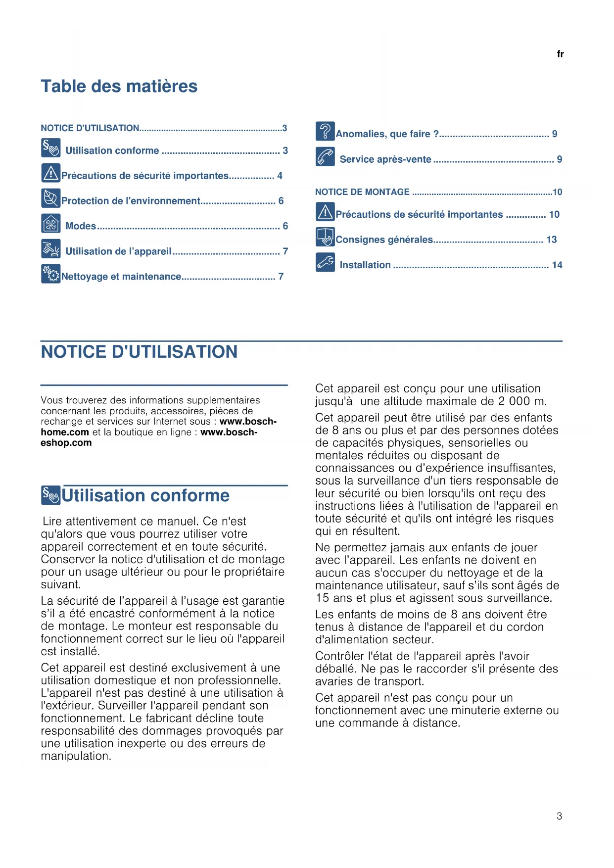 ( Précautions de sécurité importantes ............... 10 K Consignes générales......................................... 13 5 Installation .......................................................... 14 NOTICE D'UTILISATION Produktinfo Vous trouverez des informations supplementaires concernant les produits, accessoires, pièces de rechange et services sur Internet sous : www.bosch- home.com et la boutique en ligne : www.bosch- eshop.com 8Utilisation conforme Utilisation conf or me Lire attentivement ce manuel. Ce n'est qu'alors que vous pourrez utiliser votre appareil correctement et en toute sécurité. Conserver la notice d'utilisation et de montage pour un usage ultérieur ou pour le propriétaire suivant. La sécurité de l’appareil à l’usage est garantie s’il a été encastré conformément à la notice de montage. Le monteur est responsable du fonctionnement correct sur le lieu où l'appareil est installé. Cet appareil est destiné exclusivement à une utilisation domestique et non professionnelle. L'appareil n'est pas destiné à une utilisation à l'extérieur. Surveiller l'appareil pendant son fonctionnement. Le fabricant décline toute responsabilité des dommages provoqués par une utilisation inexperte ou des erreurs de manipulation. Cet appareil est conçu pour une utilisation jusqu'à une altitude maximale de 2 000 m. Cet appareil peut être utilisé par des enfants de 8 ans ou plus et par des personnes dotées de capacités physiques, sensorielles ou mentales réduites ou disposant de connaissances ou d’expérience insuffisantes, sous la surveillance d'un tiers responsable de leur sécurité ou bien lorsqu'ils ont reçu des instructions liées à l'utilisation de l'appareil en toute sécurité et qu'ils ont intégré les risques qui en résultent. Ne permettez jamais aux enfants de jouer avec l’appareil. Les enfants ne doivent en aucun cas s'occuper du nettoyage et de la maintenance utilisateur, sauf s’ils sont âgés de 15 ans et plus et agissent sous surveillance. Les enfants de moins de 8 ans doivent être tenus à distance de l'appareil et du cordon d'alimentation secteur. Contrôler l'état de l'appareil après l'avoir déballé. Ne pas le raccorder s'il présente des avaries de transport. Cet appareil n'est pas conçu pour un fonctionnement avec une minuterie externe ou une commande à distance.fr Précautions de sécurité importantes