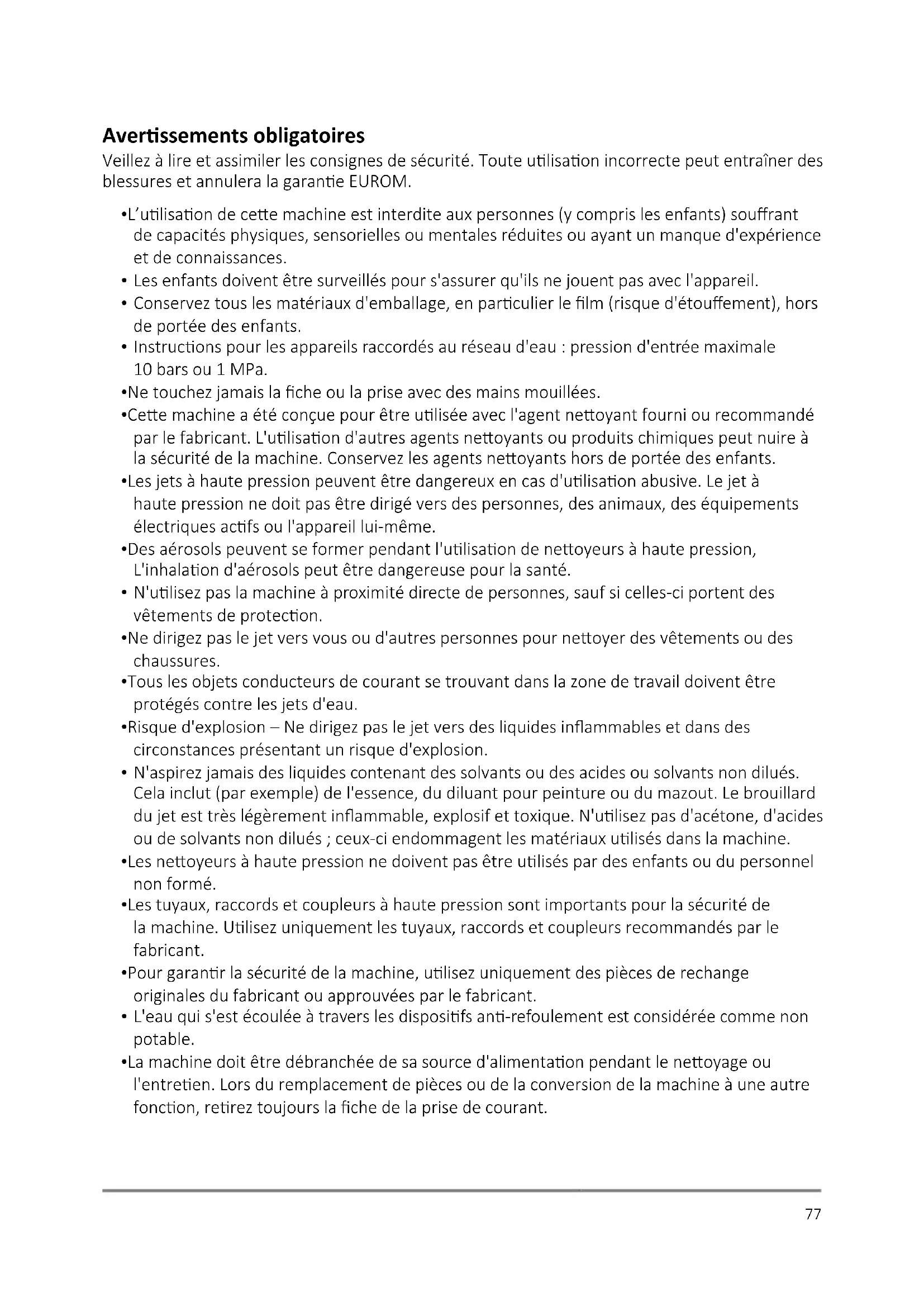 Veillez à litre et assimiler les consignes de sécurité. Toute utilisation incorrecte peut entrainer des blessures et annulera la garantie EUROM.