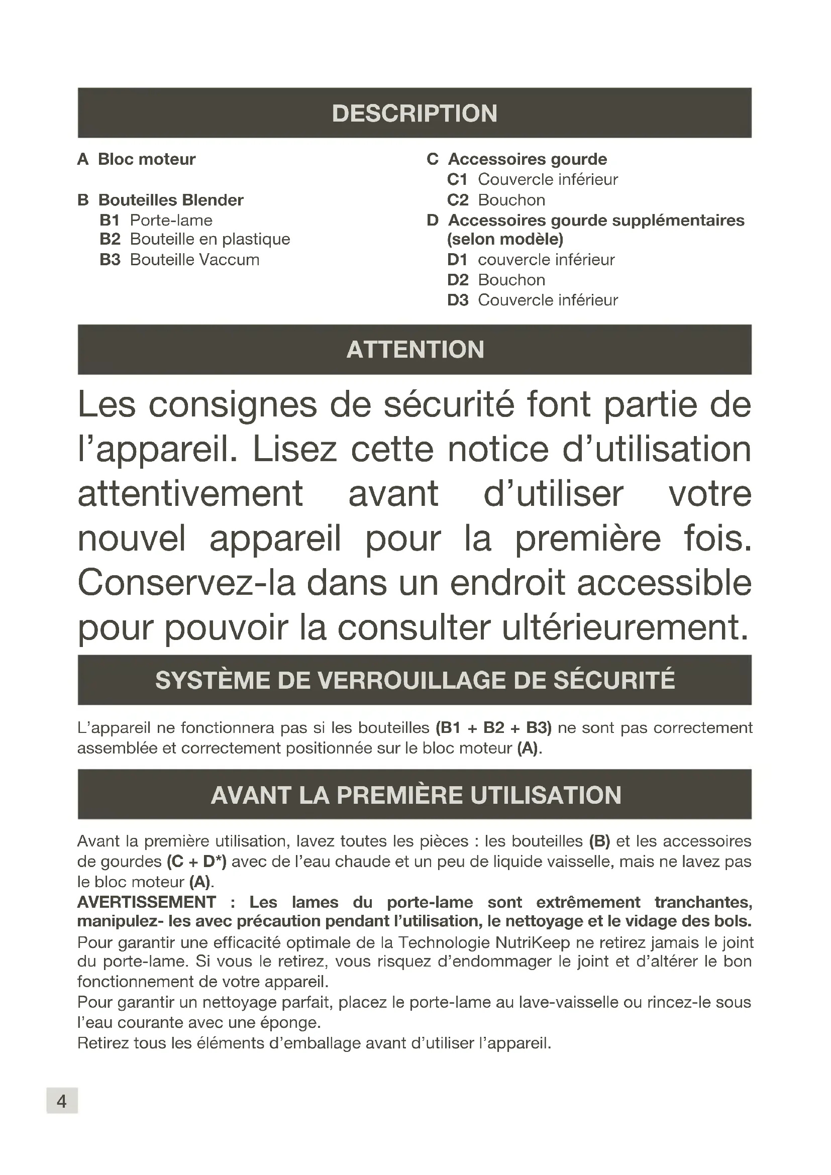 manipulez-les avec précaution pendant l’utilisation, le nettoyage et le vidage des bols. Pour garantir une efcacité optimale de la Technologie NutriKeep ne retirez jamais le joint du porte-lame. Si vous le retirez, vous risquez d’endommager le joint et d’altérer le bon fonctionnement de votre appareil. Pour garantir un nettoyage parfait, placez le porte-lame au lave-vaisselle ou rincez-le sous l’eau courante avec une éponge. Retirez tous les éléments d’emballage avant d’utiliser l’appareil. DESCRIPTION A Bloc moteur B Bouteilles Blender B1 Porte-lame B2 Bouteille en plastique B3 Bouteille Vaccum C Accessoires gourde C1 Couvercle inférieur C2 Bouchon D Accessoires gourde supplémentaires (selon modèle) D1 couvercle inférieur D2 Bouchon D3 Couvercle inférieur5 FRANÇAIS