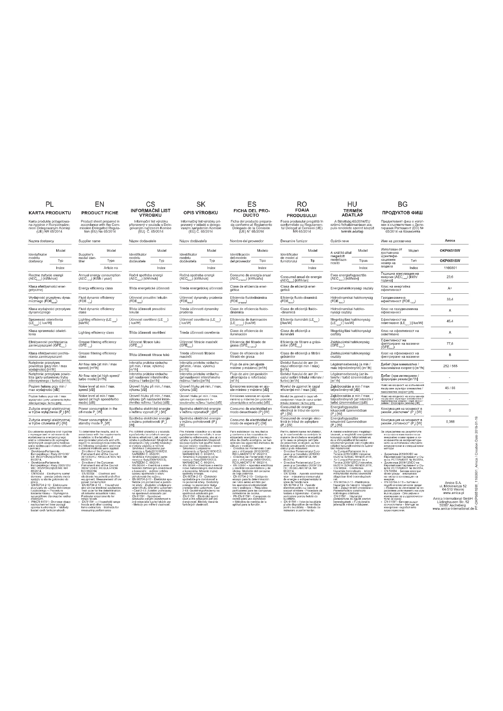 ) [W] Carte du produit préparée conformément au Règlement Délégué (UE) Nº 65/2014 de la Commission Conformément aux exigences quand à l’étiquetage énergétique et par rapport aux exigences concernant les éco-projets les méthodes de calcul et de mesure suivantes ont été appliquées pour établir les résultats : - Directive du Parlement Européen et de la Commission 2010/30/UE ; REGLEMENT Nº 65/2014, - Directive du Parlement Européen et de la Commission 2009/125/ CE ; REGLEMENT Nº 66/2014, - EN 50564 – Equipement électri- que domestique – mesure de la consommation en énergie en état de disposition au travail. - EN 60704-2-13 – Appareils électriques à utilité domestique et similaires -- Procédure de mesure de la puissance acoustique – Exigences particulières pour les hottes. - EN 61591 – Hottes domestiques et autres extracteurs de vapeurs de cuisine – Méthodes de tests des traits fonctionnels. FR NL DA SV PRODUCTKAART Naam van de leverancier Typeaandu- iding van het model van de leverancier Model Type Index Het jaarlijkse energie- verbruik (AEC afzuigkap ) [kWh/ rok] Energie-eciëntieklasse De hydrodynamische eciëntie (FDE afzuigkap