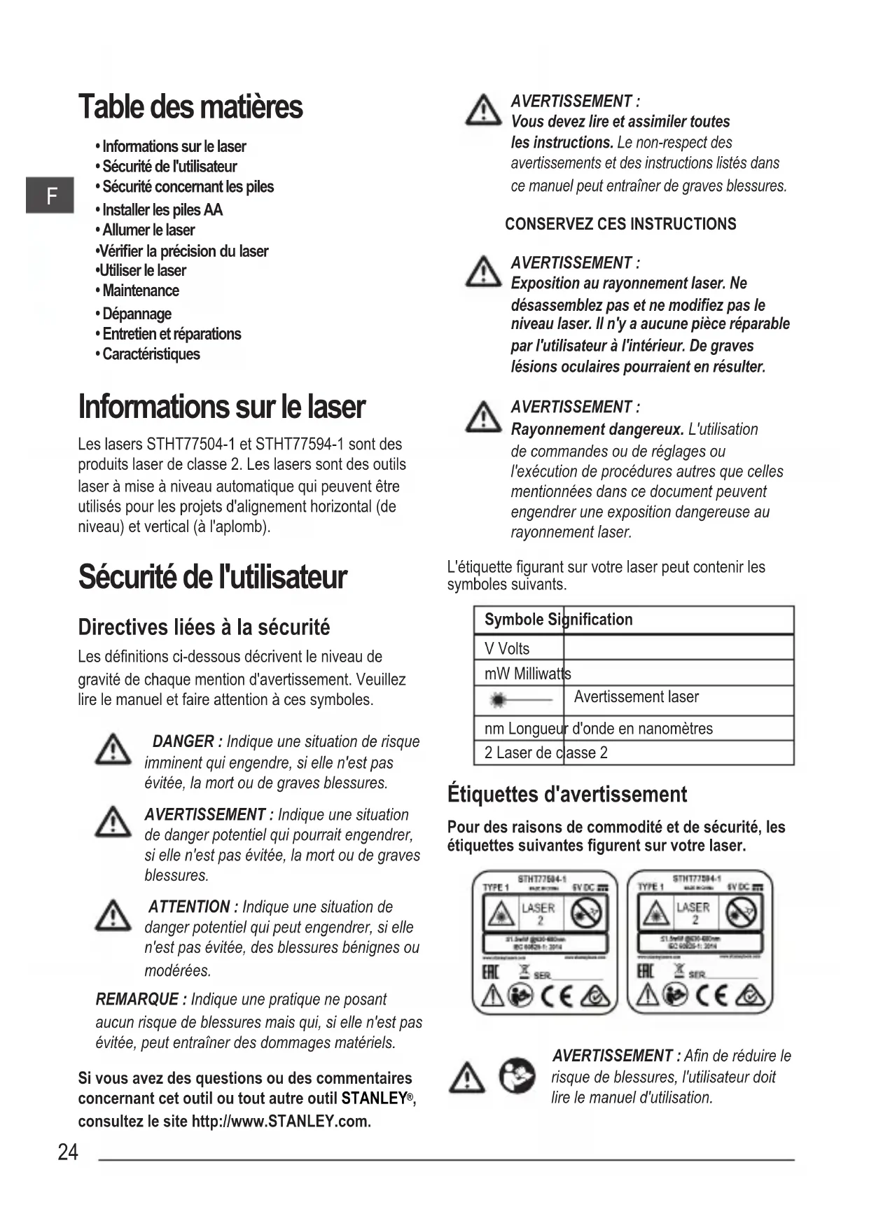 - Caractéristiques Informations sur le laser Les lasers STHT77504-1 et STHT77594-1 sont des produits laser de classe 2. Les lasers sont des outils laser à mise à niveau automatique qui peuvent être utilisés pour les projets d'alignement horizontal (de niveau) et vertical (à l'aplomb). Sécurité de l'utilisateur Directives liées à la sécurité Les dénitions ci-dessous décrivent le niveau de gravité de chaque mention d'avertissement. Veuillez lire le manuel et faire attention à ces symboles.