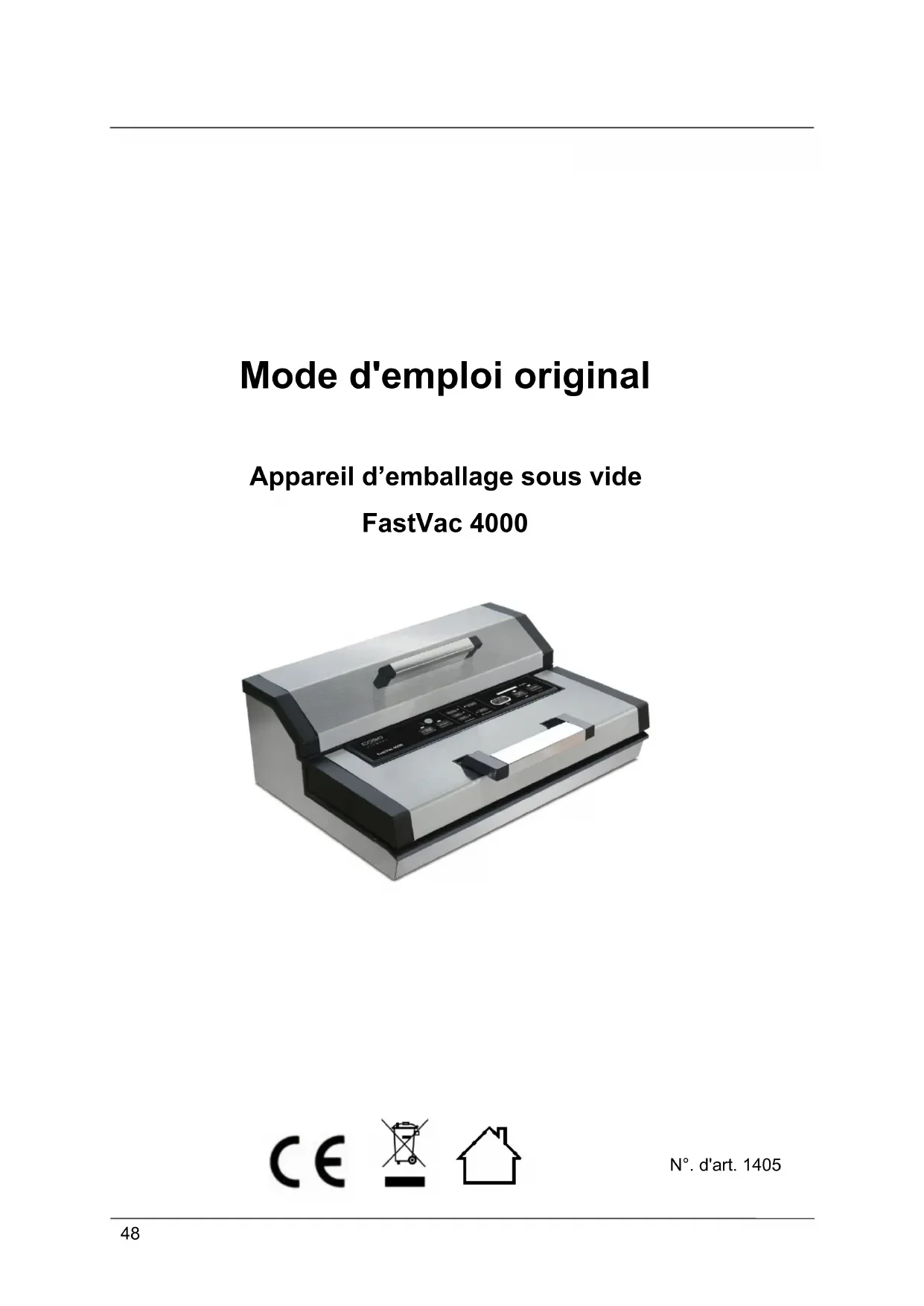 Le tableau suivant aide à la localisation et à la réparation des petits incidents. Erreur Cause possible Réparation L’emballeuse sous vide ne fonctionne pas. Fiche secteur non encastrée Enfoncer la fiche secteur Câble d'électricité ou prises de courant défectif. Envoyer l'appareil au service après-vente. Prise défective. Prendre une autre prise de courant. Le premier soudage sur la section de rouleau découpée n'est pas mis en œuvre. Le rouleau n’est pas placé correctement. Suivez les étapes dans le chapitre « Conservation dans des sacs du rouleau ». Aucun vide complet dans le sac n'est produit. L’extrémité ouverte du sac ne se trouve pas complètement dans la chambre à vide Placez correctement le sac. Le sac est défectif. Prendre un autre sac. Il y a des impuretés sur les joints d’étanchéité et/ou les autres joints. Nettoyez les joints d’étanchéité et replacez les correctement après séchage. Le sac n'est pas soudé correctement. La barre de soudage est surchauffée de sorte que le sac fond. Ouvrez le couvercle de l'appareil et laissez le refroidir quelques minutes. Le sac ne tient pas le vide après avoir été soudé. Le sac est défectif. Prendre éventuellement un autre sac, entourer éventuellement les pointes du contenu avec des serviettes en papier. Il y a des fuites à cause de miettes, graisse ou liquides le long de la soudure Ouvrez à nouveau le sac, nettoyez la partie interne supérieure du sac et éliminez les corps étrangers éventuellement existants de la barre de soudage avant de souder de nouveau le sac. Danger ► Si vous ne pouvez pas résoudre le problème à l'aide du tableau ci-dessus, adressez- vous au service après vente.66 29 Elimination des appareils usés Les appareils électriques et électroniques contiennent de nombreux matériaux recyclables. Mais ils contiennent également des produits nocifs qui sont indispensables au fonctionnement et à la sécurité. Ces derniers peuvent être nocifs pour les personnes ou pour l'environnement en cas d'élimination dans les ordures ménagères ou de traitement incorrect. Ne jamais jeter les anciens appareils avec les ordures ménagères. Remarque ► Portez les vieux appareils électriques et électroniques dans les points de collecte et de recyclage près de chez vous. Le cas échéant informez-vous auprès de la mairie, des services des ordures ou de votre concessionnaire. ► Assurez-vous que votre ancien appareil reste hors de portée des enfants jusqu'à son transport définitif. 30 Garantie Sur ce produit nous accordons une garantie de 12 mois à partir de la date d'achat pour les manques et les défauts de fabrication ou de matériaux. Vous conserver entièrement vos droits de garantie légale accordés par le §439 et suivants BGB-E. La garantie ne concerne pas les dégâts causés par une utilisation ou une manipulation non conforme, ainsi que les défauts qui n'influencent que faiblement le fonctionnement ou la valeur de l'appareil. D'autre part ne sont pas garantis également les pièces d'usure, les dommages de transport dans la mesure où ils ne sont pas sous notre responsabilité, ainsi que les dommages occasionnés par des réparations qui n'ont pas été effectuées par nos soins. La construction et la puissance de cet appareil sont conçues pour un usage commercial. En cas de recours en garantie justifié nous déciderons de réparer l'appareil ou de le remplacer par un appareil sans défaut. Les manques doivent être signalés dans un délai de 14 jours après livraison. Tout autre recours est sans objet. Pour tout recours en garantie nous vous prions d'entrer en contact avec nos services avant de nous retourner l'appareil (toujours avec le bon d'achat!). 31 Caractéristiques techniques Appareil Appareil d´emballage sans vide Nom FastVac 4000 Modèle VS5400 N°. d'article 1405 Données de raccordement 220 V -240 V; 50 Hz Puissance consommée 350 W Dimensions externes (l/h/p) 515 x 285 x 160 mm Poids net 6 kg67 Istruzioni d’uso originali Sistema di sigillatura sottovuoto FastVac 4000 Articolo-N. 140568 32 Istruzione d´uso