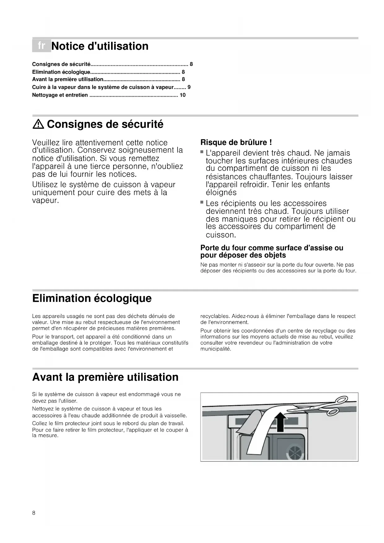 Les récipients ou les accessoires deviennent très chaud. Toujours utiliser des maniques pour retirer le récipient ou les accessoires du compartiment de cuisson. Porte du four comme surface d'assise ou pour déposer des objets Ne pas monter ni s'asseoir sur la porte du four ouverte. Ne pas déposer des récipients ou des accessoires sur la porte du four. Elimination écologique Les appareils usagés ne sont pas des déchets dénués de valeur. Une mise au rebut respectueuse de l'environnement permet d'en récupérer de précieuses matières premières. Pour le transport, cet appareil a été conditionné dans un emballage destiné à le protéger. Tous les matériaux constitutifs de l'emballage sont compatibles avec l'environnement et recyclables. Aidezаnous à éliminer l'emballage dans le respect de l'environnement. Pour obtenir les coordonnées d'un centre de recyclage ou des informations sur les moyens actuels de mise au rebut, veuillez consulter votre revendeur ou l'administration de votre municipalité. Avant la première utilisation Si le système de cuisson à vapeur est endommagé vous ne devez pas l'utiliser. Nettoyez le système de cuisson à vapeur et tous les accessoires à l'eau chaude additionnée de produit à vaisselle. Collez le film protecteur joint sous le rebord du plan de travail. Pour ce faire retirer le film protecteur, l'appliquer et le couper à la mesure.9 Cuire à la vapeur dans le système de cuisson à vapeur La base du système de cuisson à vapeur est toujours le plat profond à soufflé, le grand insert à étuver et le couvercle en verre.Pour des quantités plus importantes et la préparation de riz ou de sauces, vous pouvez utiliser en plus le support avec les bacs de cuisson.Utilisez exclusivement les pièces d'origine livrées avec l'appareil.Pour des indications supplémentaires concernant la cuisson à la vapeur, consultez la brochure jointe.Vous pouvez utiliser le plat profond à soufflé aussi individuellement, par ex. pour la préparation d'une grosse quantité de soufflé. Cuisson à la vapeur N'ouvrez pas la porte du four pendant le processus de cuisson. Exception : Si vous combinez différents mets à cuire dont les temps de cuisson sont très différents.Le temps de cuisson est déterminé par la taille de l'aliment à cuire. Lors de la cuisson simultanée d'aliments qui demandent des temps de cuisson différents, il est valable :■ Coupez en petits morceaux les aliments demandant un temps de cuisson plus long■ Allongez le temps de cuisson des aliments délicats en faisant cuire des morceaux plus grosPour la cuisson à la vapeur, utilisez toujours 500 ml d'eau (pas d'eau distillée). Exception : Les aliments qui gonflent (par ex. pommes de terre) et les ingrédients demandant des temps de cuisson longs nécessitent 750 ml d'eau (voir le tableau des cuissons ou la brochure jointe).1. Préchauffez le four 10 minutes à 150 °C en mode chaleur de sole $ ou avec la position cuisson à la vapeur é. 2. Versez l'eau dans le plat profond à soufflé.3. Mettez les aliments à cuire dans le système de cuisson à vapeur.4. Posez le couvercle en verre de telle sorte qu'il repose tout autour sur le plat profond à soufflé.5. Enfournez le système de cuisson à vapeur au niveau 1. : Risque de brûlures ! De la vapeur chaude peut s'échapper lorsque vous ouvrez la porte du four. Ouvrez prudemment le four après la cuisson.6. Retirez le système de cuisson à vapeur du four après l'écoulement du temps de cuisson. Pour cela, utilisez des maniques appropriées.7. Déposez le système de cuisson à vapeur. Ne pas le placer sur la porte du four ! : Risque de brûlures ! De la vapeur chaude s'échappe lors de l'ouverture du couvercle en verre. Levez le couvercle en verre à l'arrière, afin que la vapeur chaude puisse s'échapper loin du corps.8. Enlevez le couvercle en verre. Après la cuisson à la vapeur 1. Laissez refroidir le compartiment de cuisson.2. Essuyez le compartiment de cuisson à l'eau claire.3. Séchez le compartiment de cuisson avec un chiffon doux, derrière le joint de porte et la gouttière, entre la porte du four et le four. 3ODWSURIRQGjVRXIIOp*UDQGLQVHUWjpWXYHU6XSSRUW%DFjUL]HWjVDXFH3HWLWLQVHUWjpWXYHU&RXYHUFOHHQYHUUH