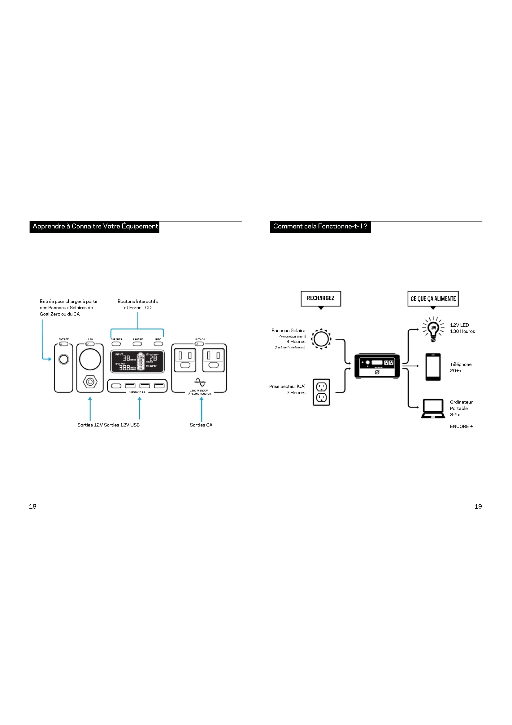 Apprendre à Connaitre Votre Équipement Entrée pour charger à partir des Panneaux Solaires de Goal Zero ou du CASorties 12V Sorties 12V USBBoutons Interactifs et Écran LCDSorties CA Comment cela Fonctionne-t-il ? Prise Secteur (CA)7 HeuresPanneau Solaire(Vendu séparément)4 Heures(Basé sur l'entrée max.)12V LED130 HeuresTéléphone 20+x Ordinateur Portable 3-5x ENCORE + RECHARGEZ Phone / Phone 30x Laptop /Ordinateur portable 6-8x