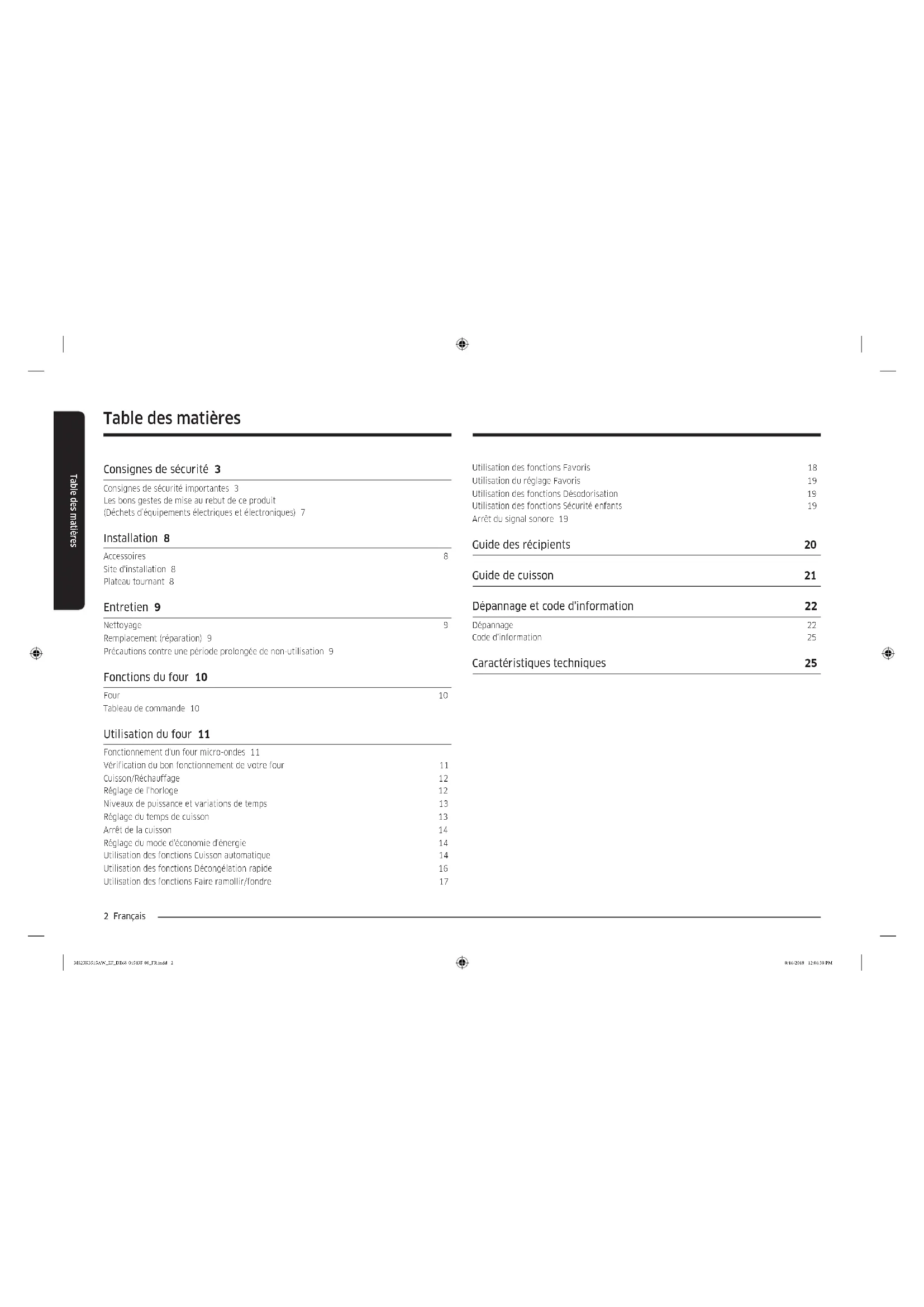 Four à micro-ondes Manuel d'utilisation MS23K3515** MS23K3515AW_EF_DE68-04543F-00_FR.indd 1 8/16/2018 12:06:38 PM2 Français Table des matières Table des matières Consignes de sécurité 3 Consignes de sécurité importantes 3 Les bons gestes de mise au rebut de ce produit (Déchets d’équipements électriques et électroniques) 7 Installation 8 Accessoires 8 Site d'installation 8 Plateau tournant 8 Entretien 9 Nettoyage 9 Remplacement (réparation) 9 Précautions contre une période prolongée de non-utilisation 9 Fonctions du four 10 Four 10 Tableau de commande 10 Utilisation du four 11 Fonctionnement d'un four micro-ondes 11 Vérification du bon fonctionnement de votre four 11 Cuisson/Réchauffage 12 Réglage de l'horloge 12 Niveaux de puissance et variations de temps 13 Réglage du temps de cuisson 13 Arrêt de la cuisson 14 Réglage du mode d'économie d'énergie 14 Utilisation des fonctions Cuisson automatique 14 Utilisation des fonctions Décongélation rapide 16 Utilisation des fonctions Faire ramollir/fondre 17 Utilisation des fonctions Favoris 18 Utilisation du réglage Favoris 19 Utilisation des fonctions Désodorisation 19 Utilisation des fonctions Sécurité enfants 19 Arrêt du signal sonore 19 Guide des récipients 20 Guide de cuisson 21 Dépannage et code d'information 22 Dépannage 22 Code d'information 25 Caractéristiques techniques 25 MS23K3515AW_EF_DE68-04543F-00_FR.indd 2 8/16/2018 12:06:38 PMFrançais 3 Consignes de sécurité Consignes de sécurité