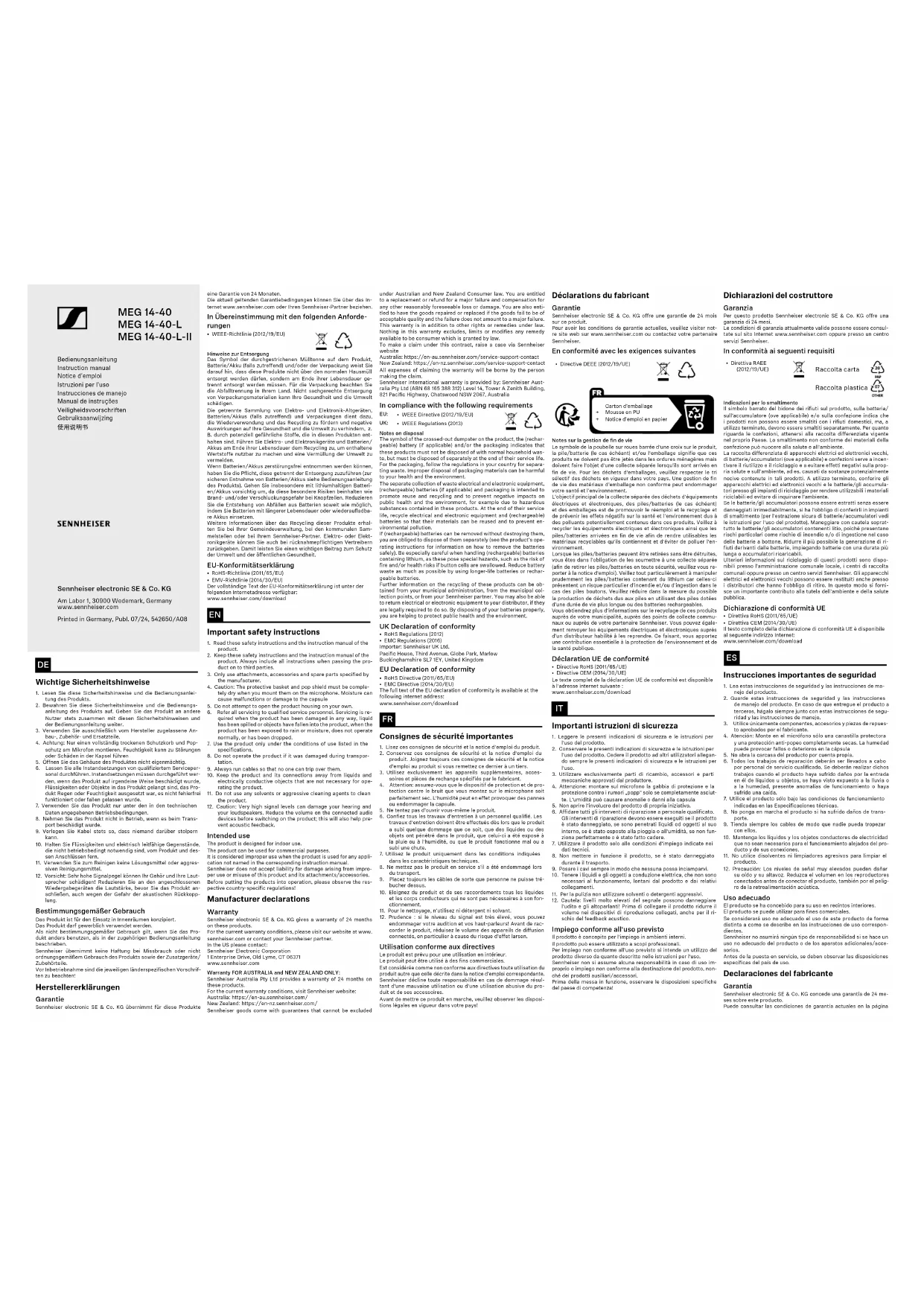 BedienungsanleitungInstruction manualNotice d'emploiIstruzioni per l'usoInstrucciones de manejoManual de instruçõesVeiligheidsvoorschriftenGebruiksaanwijzing使用说明书 Déclarations du fabricant Garantie Sennheiser electronic SE & Co. KG offre une garantie de 24 mois sur ce produit.Pour avoir les conditions de garantie actuelles, veuillez visiter not-re site web sur www.sennheiser.com ou contactez votre partenaire Sennheiser. En conformité avec les exigences suivantes