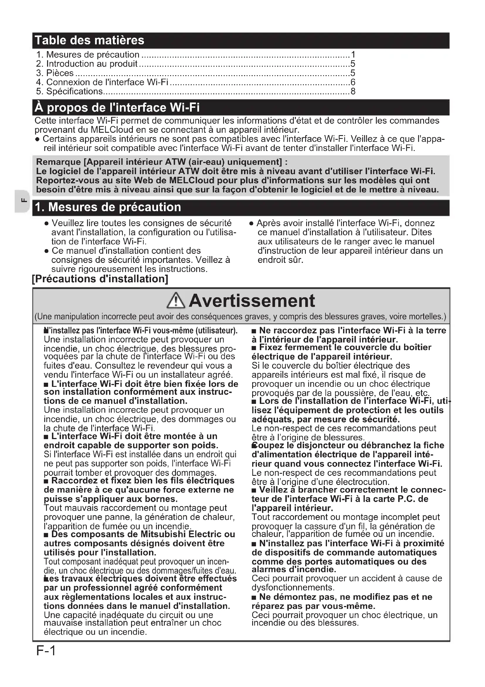 N'installez pas l'interface Wi-Fi vous-même (utilisateur). Uneinstallationincorrectepeutprovoquerun incendie,unchocélectrique,desblessurespro- voquéesparlachutedel'interfaceWi-Fioudes fuitesd'eau.Consultezlerevendeurquivousa vendul'interfaceWi-Fiouuninstallateuragréé. ■ L'interface Wi-Fi doit être bien xée lors de son installation conformément aux instruc- tions de ce manuel d'installation. Uneinstallationincorrectepeutprovoquerun incendie,unchocélectrique,desdommagesou lachutedel'interfaceWi-Fi. ■ L'interface Wi-Fi doit être montée à un endroit capable de supporter son poids. Sil'interfaceWi-Fiestinstalléedansunendroitqui nepeutpassupportersonpoids,l'interfaceWi-Fi pourraittomberetprovoquerdesdommages. ■ Raccordez et xez bien les ls électriques de manière à ce qu'aucune force externe ne puisse s'appliquer aux bornes. Toutmauvaisraccordementoumontagepeut provoquerunepanne,lagénérationdechaleur, l'apparitiondefuméeouunincendie. ■ Des composants de Mitsubishi Electric ou autres composants désignés doivent être utilisés pour l'installation. Toutcomposantinadéquatpeutprovoquerunincen- die,unchocélectriqueoudesdommages/fuitesd'eau.