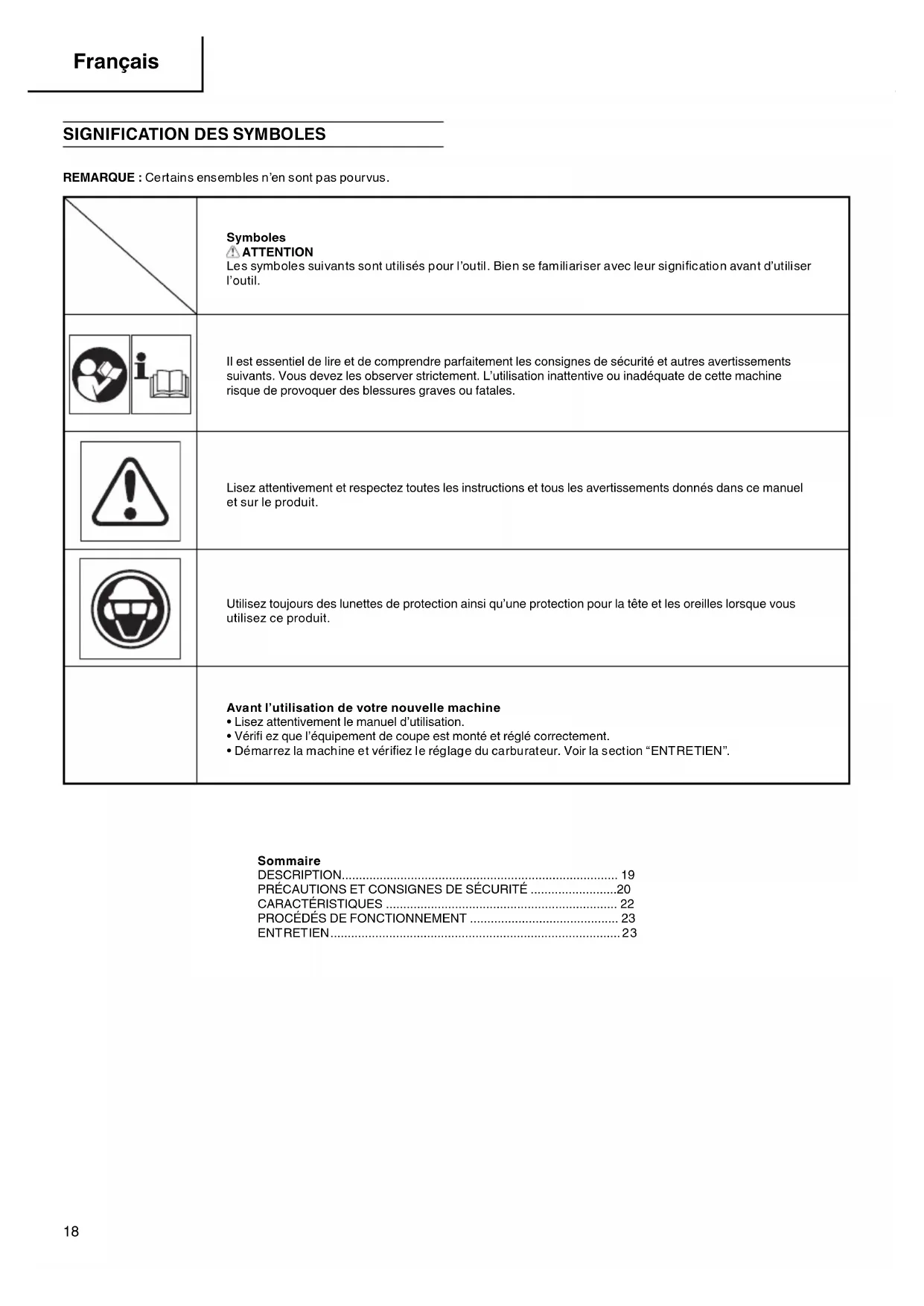 REMARQUE : Certains ensembles n’en sont pas pourvus. Symboles ATTENTION Les symboles suivants sont utilisés pour l’outil. Bien se familiariser avec leur signifi cation avant d’utiliser l’outil. II est essentiel de lire et de comprendre parfaitement les consignes de sécurité et autres avertissements suivants. Vous devez les observer strictement. L’utilisation inattentive ou inadéquate de cette machine risque de provoquer des blessures graves ou fatales. Lisez attentivement et respectez toutes les instructions et tous les avertissements donnés dans ce manuel et sur le produit. Utilisez toujours des lunettes de protection ainsi qu’une protection pour la tête et les oreilles lorsque vous utilisez ce produit. Avant l’utilisation de votre nouvelle machine