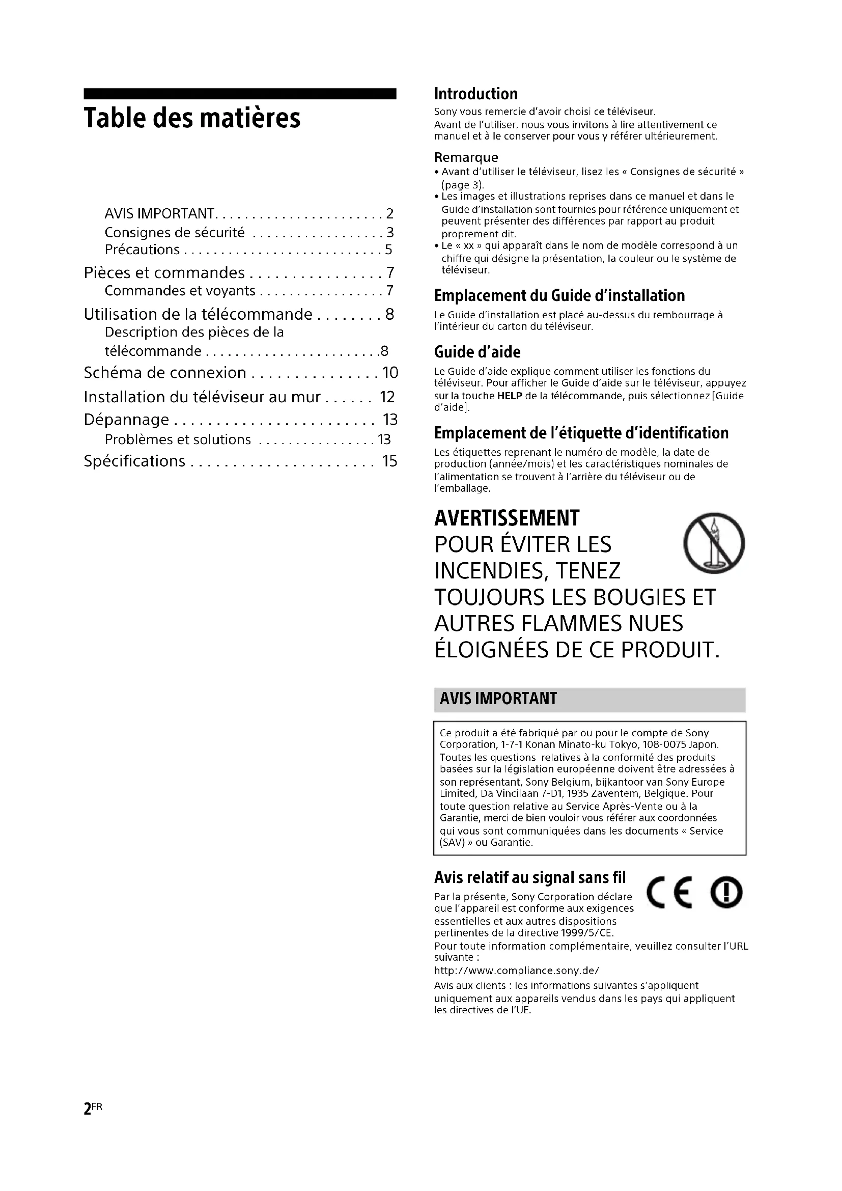 - Spécifications Introduction Sony vous remercie d’avoir choisi ce téléviseur. Avant de l’utiliser, nous vous invitons à lire attentivement ce manuel et à le conserver pour vous y référer ultérieurement. Remarque p. 15