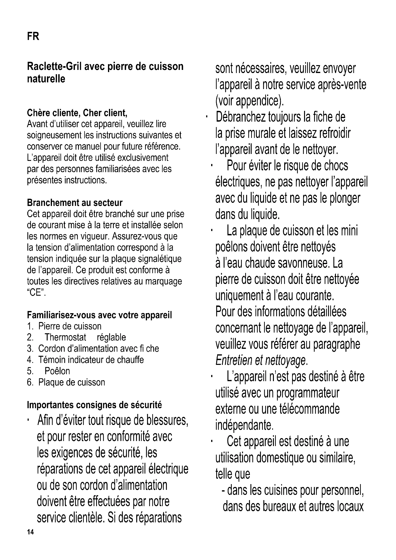 Importantes consignes de sécurité ∙ A fi n d’éviter tout risque de blessures, et pour rester en conformité avec les exigences de sécurité, les réparations de cet appareil électrique ou de son cordon d’alimentation doivent être effectuées par notre service clientèle. Si des réparations sont nécessaires, veuillez envoyer l’appareil à notre service après-vente (voir appendice). ∙ Débranchez toujours la fi che de la prise murale et laissez refroidir l’appareil avant de le nettoyer. ∙ Pour éviter le risque de chocs électriques, ne pas nettoyer l’appareil avec du liquide et ne pas le plonger dans du liquide. ∙ La plaque de cuisson et les mini poêlons doivent être nettoyés à l’eau chaude savonneuse. La pierre de cuisson doit être nettoyée uniquement à l’eau courante. Pour des informations détaillées concernant le nettoyage de l’appareil, veuillez vous référer au paragraphe Entretien et nettoyage. ∙ L’appareil n’est pas destiné à être utilisé avec un programmateur externe ou une télécommande indépendante. ∙ Cet appareil est destiné à une utilisation domestique ou similaire, telle que - dans les cuisines pour personnel, dans des bureaux et autres locaux FR15 commerciaux, - dans des organisations agricoles, - par la clientèle dans les hôtels, motels et hébergements similaires, - et dans des maisons d’hôtes. ∙ Cet appareil peut être utilisé par des enfants (à partir de 8 ans) et par des personnes souffrant de défi ciences physiques, sensorielles ou mentales, ou manquant d’expérience ou de connaissances, s’ils ont été formés à l’utilisation de l’appareil et ont été supervisés, et s’ils en comprennent les dangers et les précautions de sécurité à prendre. ∙ Les enfants ne sont pas autorisés à jouer avec l’appareil. ∙ Les enfants ne doivent pas être autorisés à nettoyer ou entretenir l’appareil à moins d’être supervisés et d’avoir plus de 8 ans. ∙ L’appareil et son cordon d’alimentation doivent être, à tout moment, tenus hors de portée des enfants de moins de 8 ans. ∙ Attention : Tenez les enfants à l’écart des emballages, qui représentent un risque potentiel, par exemple, de suffocation. ∙ Avant d’utiliser cet appareil, le corps principal comprenant le cordon d’alimentation ainsi que tout accessoire en place doivent être soigneusement vérifi és afi n de détecter des dommages ou défauts éventuels. Au cas où l’appareil, par exemple, serait tombé sur une surface dure, ou si une force excessive aurait été employée pour tirer sur le cordon d’alimentation, il ne doit plus être utilisé. ∙ Le cordon doit toujours être tenu à l’écart des surfaces chaudes de l’appareil. ∙ Attention : Risque de brûlure. Les parties extérieures de l’appareil, les surfaces de cuisson et les mini poêlons deviennent chauds pendant l’utilisation. ∙ Ne jamais faire fonctionner l’appareil sans surveillance. ∙ Placez l’appareil sur une surface de travail plane, horizontale et résistante à la chaleur et aux éclaboussures d’eau ou de graisse. ∙ Prenez soin de ne pas placer l’appareil contre un mur ou dans un angle, et de le tenir à l’écart de toute matière infl ammable. ∙ Avant l’utilisation, placez la pierre et la plaque de cuisson sur l’appareil, au- dessus de la résistance. ∙ Attention : N’utilisez pas l’appareil à l’extérieur. ∙ Débranchez toujours la fi che de la prise murale - après utilisation, - en cas de fonctionnement défectueux, - avant de nettoyer l’appareil. ∙ Ne pas débrancher l’appareil en tirant sur le cordon ; tirez toujours sur la fi che. ∙ L’appareil doit être utilisé uniquement avec les accessoires originaux.16 ∙ Laissez toujours suffi samment de temps à l’appareil de refroidir avant de retirer la pierre et la plaque de cuisson, avant de le nettoyer ou de le ranger. ∙ Nous déclinons toute responsabilité pour les dommages éventuels subis par cet appareil, résultant d’une utilisation incorrecte ou du non-respect de ce mode d’emploi. Fonctionnement Avant la première utilisation Retirez complètement tous les emballages. Avant d’utiliser le gril pour la première fois, nettoyez la pierre, la plaque de cuisson et les mini poêlons avec un chiffon humide. Nous vous conseillons de laisser chauffer l’appareil et les poêlons pendant environ 10 minutes, sans aliment, afi n d’éliminer l’odeur qui se dégage en général d’un gril lorsqu’il est mis en marche pour la première fois. Lors de cette première mise en marche, une légère odeur et un peu de fumée peuvent se dégager. Assurez une ventilation suffi sante pendant l’opération. Pierre de cuisson ∙ Placez la pierre de cuisson sur l’appareil, par-dessus la résistance, la face polie vers le haut. Assurez-vous que les encoches sous la pierre de cuisson s’adaptent sur les rails de guidage du cadre d’appui de façon à ce que la pierre ne puisse bouger. ∙ Attention : évitez de placer une pierre froide sur la résistance chaude. ∙ La pierre convient à la cuisson de légumes, viandes ou poissons en tranches etc. ∙ Cette pierre est constituée de matière naturelle. L’apparition de très fi nes fi ssures dues à l’expansion et la contraction pendant la cuisson, ainsi que la coloration plus marquée de la pierre, sont des phénomènes normaux sans effets préjudiciables. ∙ Ne placez sur la pierre aucun aliment surgelé ni aliment contenant du vinaigre (tel que cornichon au vinaigre ou moutarde). Plaque de cuisson ∙ Avant de mettre l’appareil en marche, posez la plaque sur l’appareil, par-dessus la résistance, face rainurée vers le haut. ∙ Les encoches sous la plaque doivent s’adapter sur les rails de guidage du cadre d’appui. Déplacez légèrement la plaque de cuisson vers le côté pour la verrouiller en respectant les repères de la plaque. ∙ La plaque de cuisson peut être u