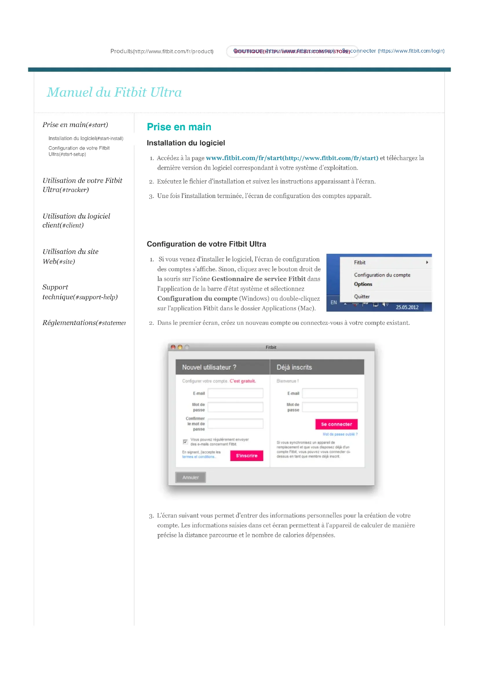 Manuel du Fitbit Ultra Prise en main(#start) Configuration de votre FitbitUltra(#start-setup) Utilisation de votre Fitbit Ultra(#tracker) Utilisation du logiciel client(#client) Utilisation du site Web(#site) Support technique(#support-help) Réglementations(#statements) Prise en main Installation du logiciel