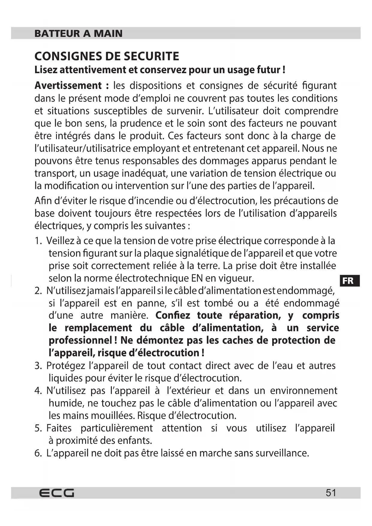 l’appareil et son câble d’alimentation hors de portée des enfants. Cet appareil peut être utilisé par les personnes aux capacités physiques, cognitives ou mentales réduites, ou sans expérience et connaissances susantes, si elles sont sous surveillance ou ont été formées àl’utilisation de l’appareil d’une manière sûre, et ont conscience des éventuels dangers. Les enfants ne doivent pas jouer avec l’appareil. Do not immerse the appliance body in water! – Ne pas plonger le corps de l’appareil dans l’eau ! DANGER pour les enfants : Les enfants ne doivent pas jouer avec les matériaux d’emballage. Ne laissez pas les enfants jouer avec les sacs en plastique. Risque d’étouement. AVANT DE METTRE LE BATTEUR EN MARCHE Avant la première utilisation, lavez les crochets et les fouets à l’eau chaude savonneuse. Rincez ensuite bien les accessoires à l’eau claire et séchez bien, voir procédure du chapitre Nettoyage et entretien.FR