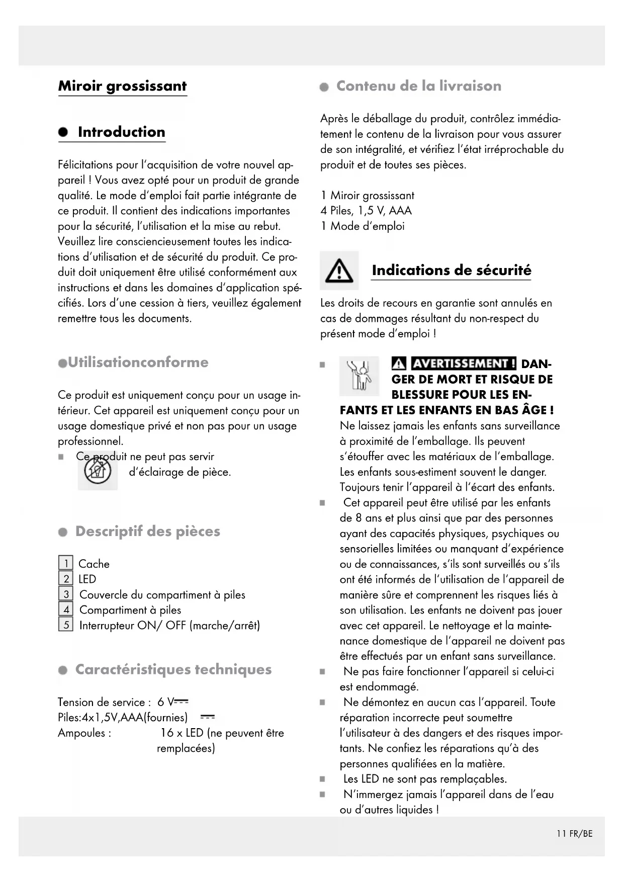 for normalt slid og derfor kan betragtes som nor male sliddele (f.eks. batterier) eller ved skader på skrø- belige dele; f.eks. kontakter, akkumulatorer som er fremstillet i glas.11 FR/BE Miroir grossissant Introduction Félicitations pour l‘acquisition de votre nouvel ap- pareil ! Vous avez opté pour un produit de grande qualité. Le mode d‘emploi fait partie intégrante de ce produit. Il contient des indications importantes pour la sécurité, l’utilisation et la mise au rebut. Veuillez lire consciencieusement toutes les indica- tions d‘utilisation et de sécurité du produit. Ce pro- duit doit uniquement être utilisé conformément aux instructions et dans les domaines d‘application spé- cifiés. Lors d‘une cession à tiers, veuillez également remettre tous les documents. Utilisation conforme Ce produit est uniquement conçu pour un usage in- térieur. Cet appareil est uniquement conçu pour un usage domestique privé et non pas pour un usage professionnel. Ce produit ne peut pas servir d‘éclairage de pièce. Descriptif des pièces