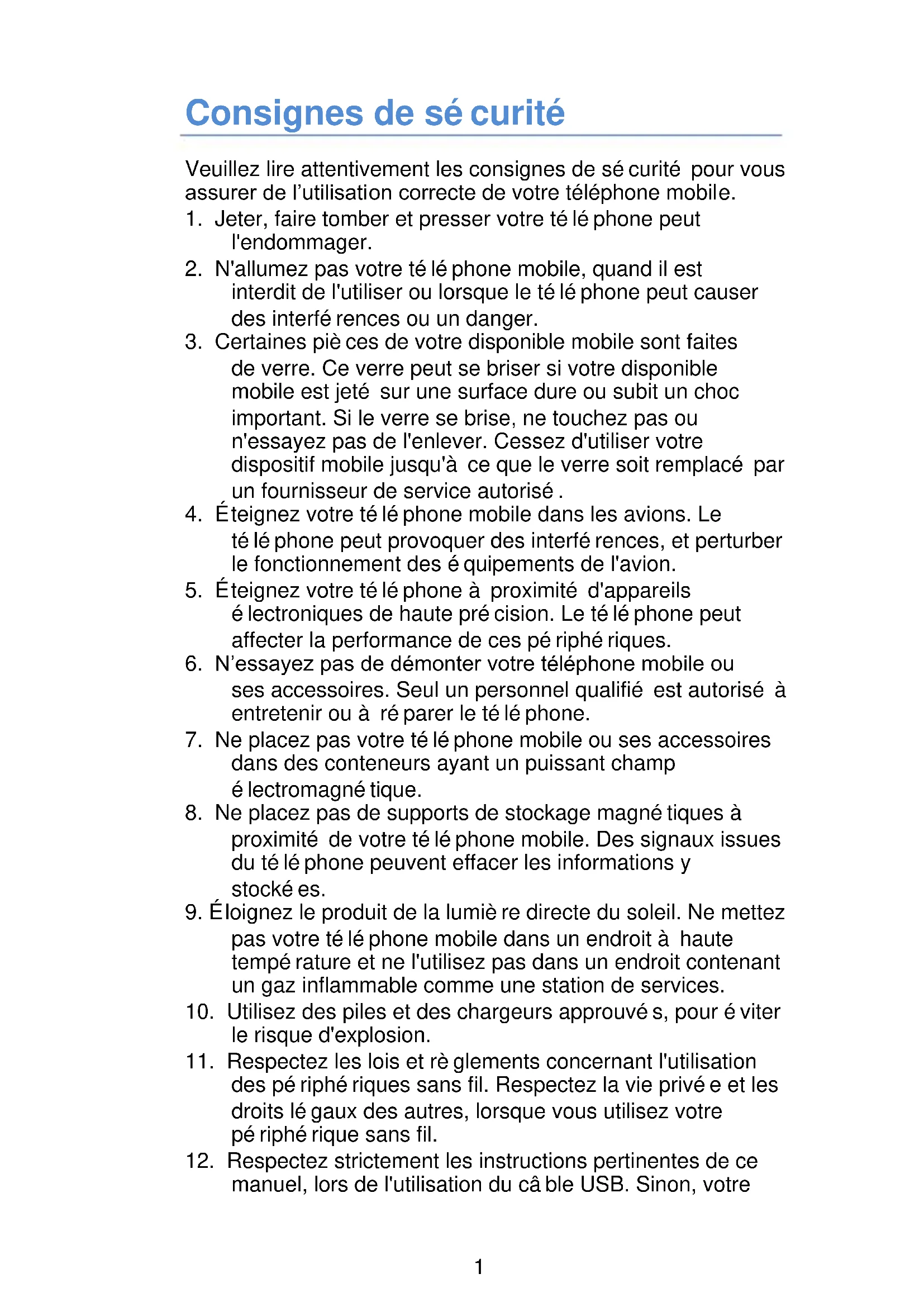 Considérations waterproof ................................................... 291 Consignes de sécurité Veuillez lire attentivement les consignes de sécurité pour vous assurer de l’utilisation correcte de votre téléphone mobile.