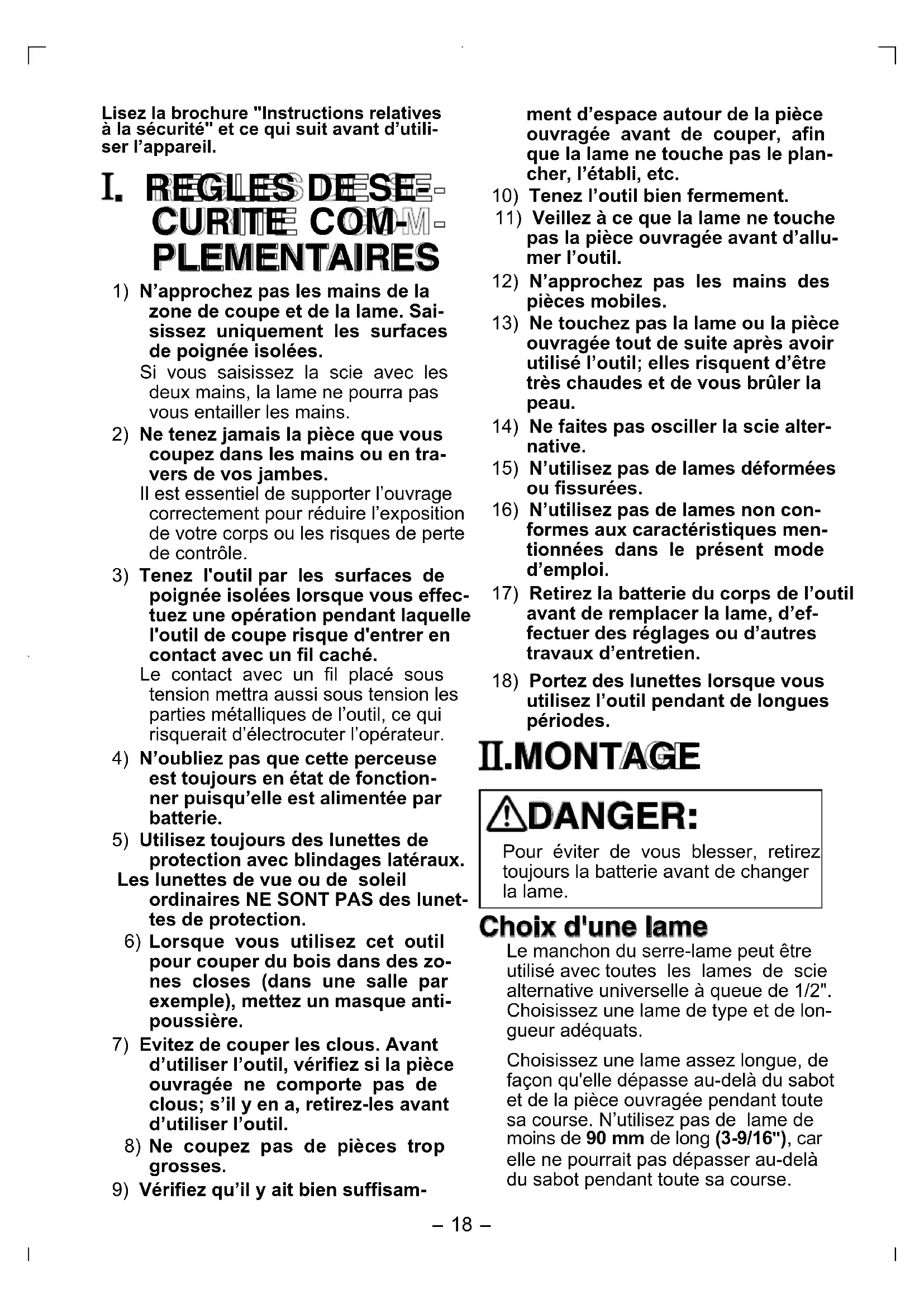 Pour éviter de vous blesser, retirez toujours la batterie avant de changer la lame. Choix d'une lame Le manchon du serre-lame peut être utilisé avec toutes les lames de scie alternative universelle à queue de 1/2". Choisissez une lame de type et de lon- gueur adéquats. Choisissez une lame assez longue, de façon qu'elle dépasse au-delà du sabot et de la pièce ouvragée pendant toute sa course. N’utilisez pas de lame de moins de 90 mm de long (3-9/16"), car elle ne pourrait pas dépasser au-delà du sabot pendant toute sa course.-