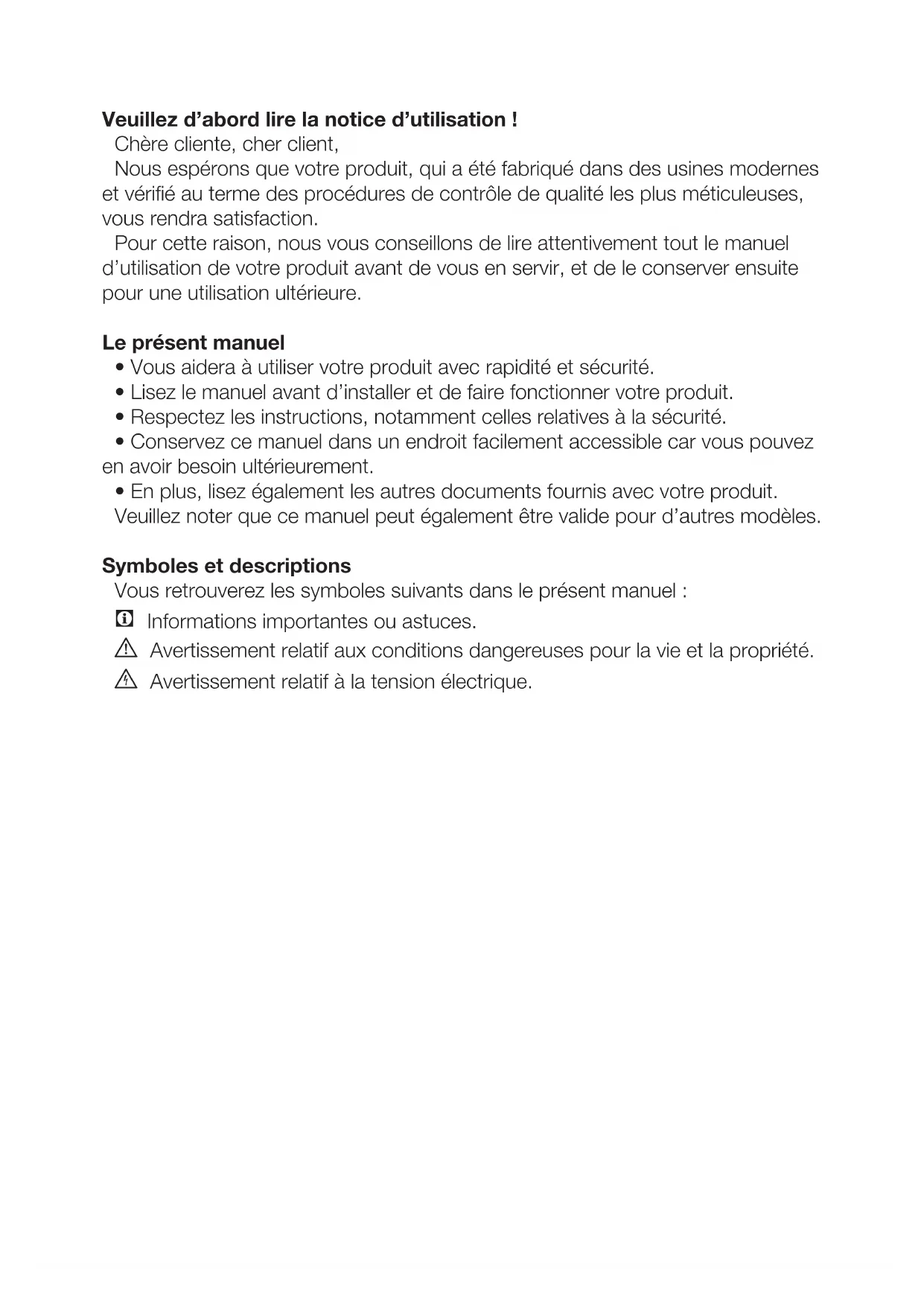 - En plus, lisez également les autres documents fournis avec votre produit. Veuillez noter que ce manuel peut également être valide pour d’autres modèles. Symboles et descriptions Vous retrouverez les symboles suivants dans le présent manuel : C Informations importantes ou astuces. A Avertissement relatif aux conditions dangereuses pour la vie et la propriété. B Avertissement relatif à la tension électrique.2