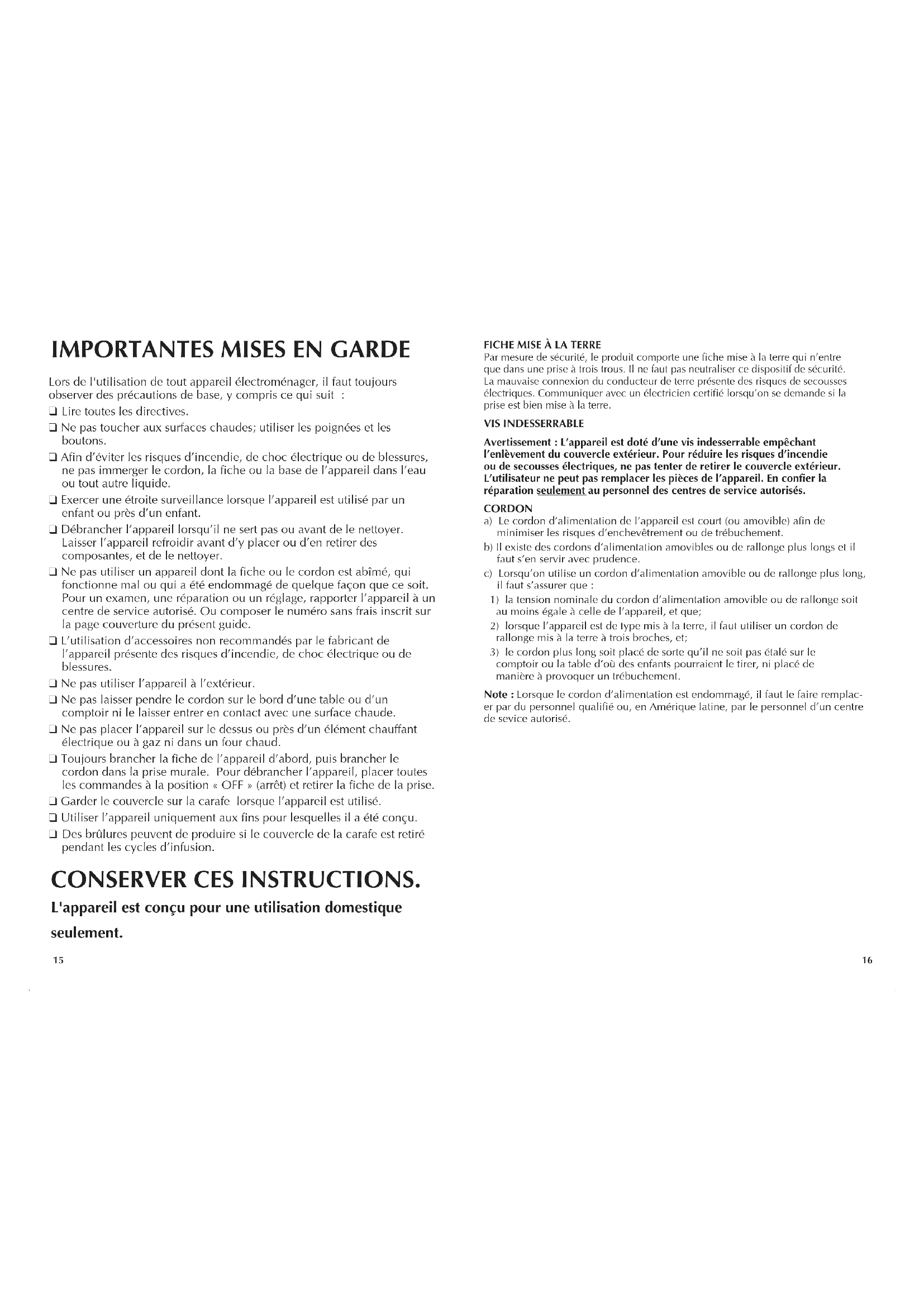 Garder le couvercle sur la carafe lorsque l’appareil est utilisé.