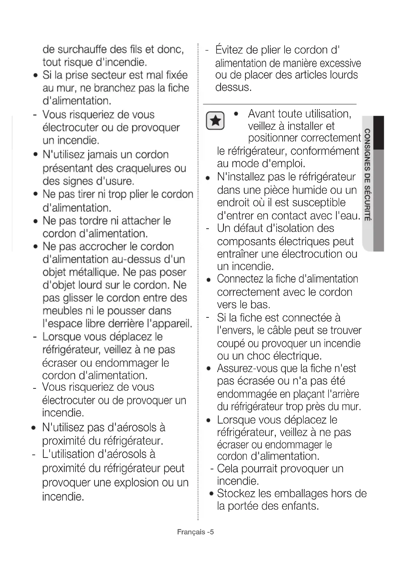 écraser ou endommager le cordon d'alimentation. Vous risqueriez de vous électrocuter ou de provoquer un incendie. N'utilisez pas d'aérosols à proximité du réfrigérateur. L'utilisation d'aérosols à proximité du réfrigérateur peut provoquer une explosion ou un incendie. le réfrigérateur, conformément au mode d'emploi. Français -5Évitez de poser des objets (linge, bougies allumées, cigarettes allumées, vaisselle, produits chimiques, objets métalliques, etc.) sur l'appareil et vous- même, ne montez pas dessus. Vous risqueriez de vous électrocuter, de provoquer un incendie, une explosion, des problèmes impliquant le produit ou des blessures.