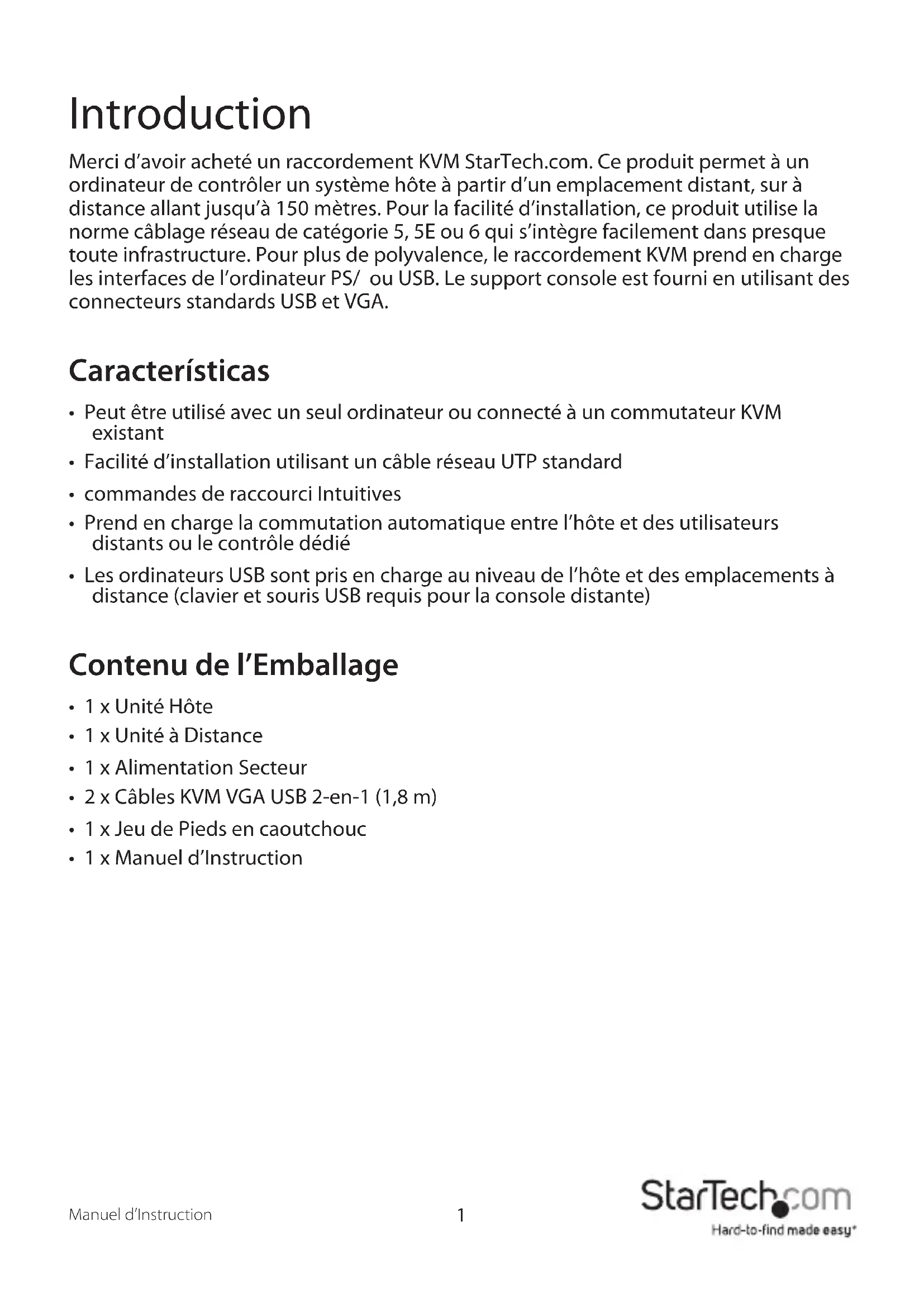 - Consulter votre revendeur ou un technicien radio / TV pour de l’aide. Utilisation des marques, marques déposées, et d’autres dénominations et symboles protégés Ce manuel peut faire référence à des marques, marques déposées, et d’autres dénominations et symboles protégés de sociétés tierces non liés en aucune façon à StarTech.com. Ces références sont à titre indicatif seulement et ne constituent pas une approbation d’un produit ou service par StarTech.com, ou un endossement du/des produit(s) auquel ce manuel s’applique par la société tierce en question. Indépendamment de toute reconnaissance directe dans le corps de manuel, StarTech.com reconnaît que toutes les marques, marques déposées, marques de service, et autres symboles et/ou dénominations protégées contenus dans ce manuel et les documents connexes sont la propriété de leurs détenteurs respectifs.i Manuel d’Instruction Table des Matières Introduction ............................................................................................1 Caractéristiques ............................................................................................................................. 1 Conguration Requise ................................................................................................................. 1 Contenu de l’Emballage .............................................................................................................. 2 Connexion de votre Raccordement KVM ...........................................3 Préparation de l’installation ....................................................................................................... 3 Installation de l’Unité Hôte ........................................................................................................ 4 Installation de l’Unité à Distance ............................................................................................. 5 Compensation Vidéo .............................................................................6 Utilizando el Extendedor KVM .............................................................7 Utilisation du Raccordement KVM .......................................................................................... 7 Utilisation de l’Unité Hôte .......................................................................................................... 10 Utilisation de l’Unité à Distance ............................................................................................... 11 Codes de Bips .................................................................................................................................. 13 Spécications ..........................................................................................14 Connecteur broche RJ-45 ........................................................................................................... 14 Produits Accessoires StarTech.com ....................................................15 Support Technique.................................................................................16 Informations sur la Garantie ................................................................161 Manuel d’Instruction Introduction Merci d’avoir acheté un raccordement KVM StarTech.com. Ce produit permet à un ordinateur de contrôler un système hôte à partir d’un emplacement distant, sur à distance allant jusqu’à 150 mètres. Pour la facilité d’installation, ce produit utilise la norme câblage réseau de catégorie 5, 5E ou 6 qui s’intègre facilement dans presque toute infrastructure. Pour plus de polyvalence, le raccordement KVM prend en charge les interfaces de l’ordinateur PS/ ou USB. Le support console est fourni en utilisant des connecteurs standards USB et VGA. Características