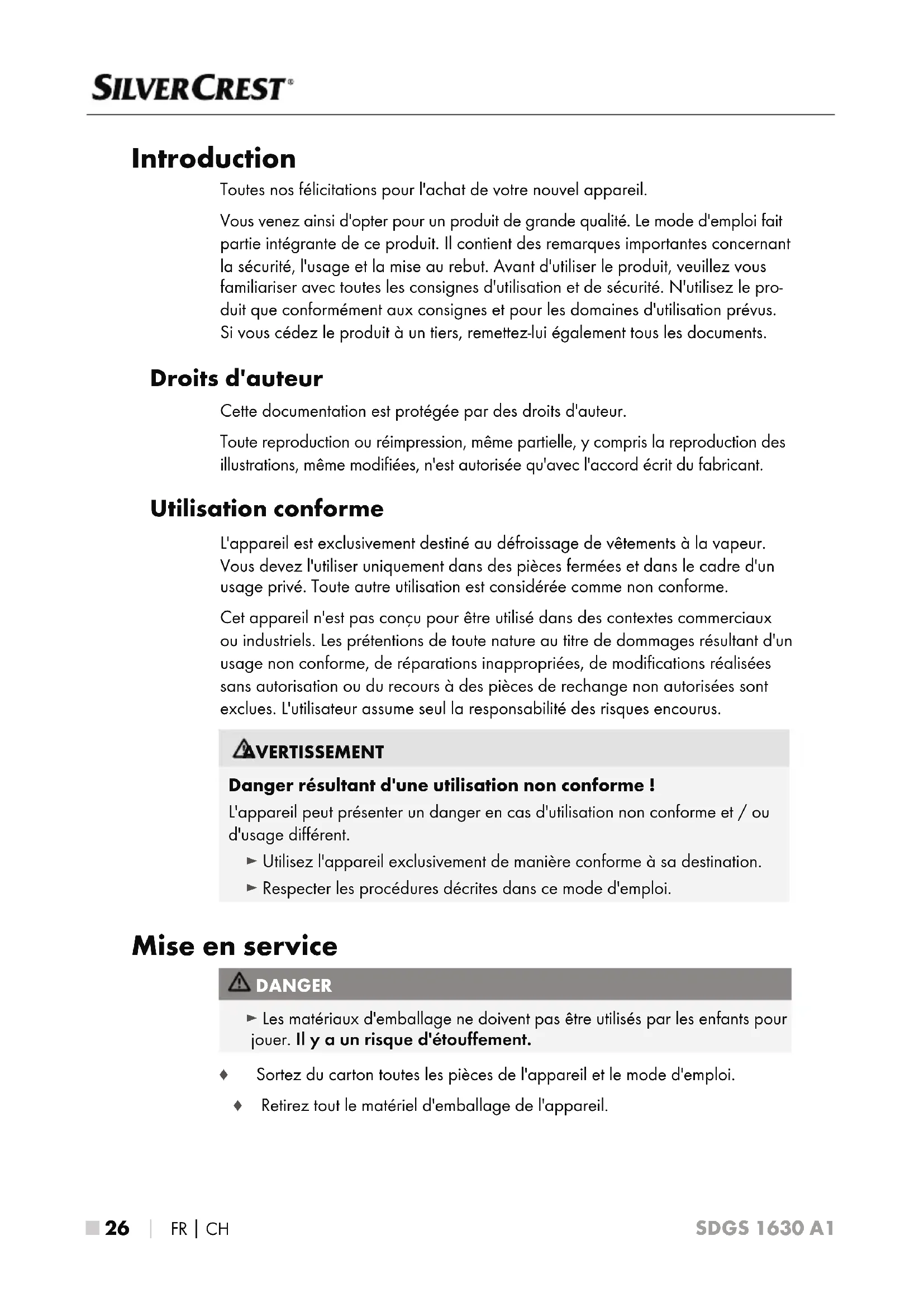 SDGS 1630 A1 Introduction Toutes nos félicitations pour l'achat de votre nouvel appareil. Vous venez ainsi d'opter pour un produit de grande qualité. Le mode d'emploi fait partie intégrante de ce produit. Il contient des remarques importantes concernant la sécurité, l'usage et la mise au rebut. Avant d'utiliser le produit, veuillez vous familiariser avec toutes les consignes d'utilisation et de sécurité. N'utilisez le pro- duit que conformément aux consignes et pour les domaines d'utilisation prévus. Si vous cédez le produit à un tiers, remettez-lui également tous les documents. Droits d'auteur Cette documentation est protégée par des droits d'auteur. Toute reproduction ou réimpression, même partielle, y compris la reproduction des illustrations, même modifiées, n'est autorisée qu'avec l'accord écrit du fabricant. Utilisation conforme L'appareil est exclusivement destiné au défroissage de vêtements à la vapeur. Vous devez l'utiliser uniquement dans des pièces fermées et dans le cadre d'un usage privé. Toute autre utilisation est considérée comme non conforme. Cet appareil n'est pas conçu pour être utilisé dans des contextes commerciaux ou industriels. Les prétentions de toute nature au titre de dommages résultant d'un usage non conforme, de réparations inappropriées, de modifications réalisées sans autorisation ou du recours à des pièces de rechange non autorisées sont exclues. L'utilisateur assume seul la responsabilité des risques encourus. AVERTISSEMENT Danger résultant d'une utilisation non conforme! L'appareil peut présenter un danger en cas d'utilisation non conforme et / ou d'usage différent. ► Utilisez l'appareil exclusivement de manière conforme à sa destination. ► Respecter les procédures décrites dans ce mode d'emploi. Mise en service DANGER ► Les matériaux d'emballage ne doivent pas être utilisés par les enfants pour jouer. Il y a un risque d'étouffement. Ƈ Sortez du carton toutes les pièces de l'appareil et le mode d'emploi. Ƈ Retirez tout le matériel d'emballage de l'appareil.FR