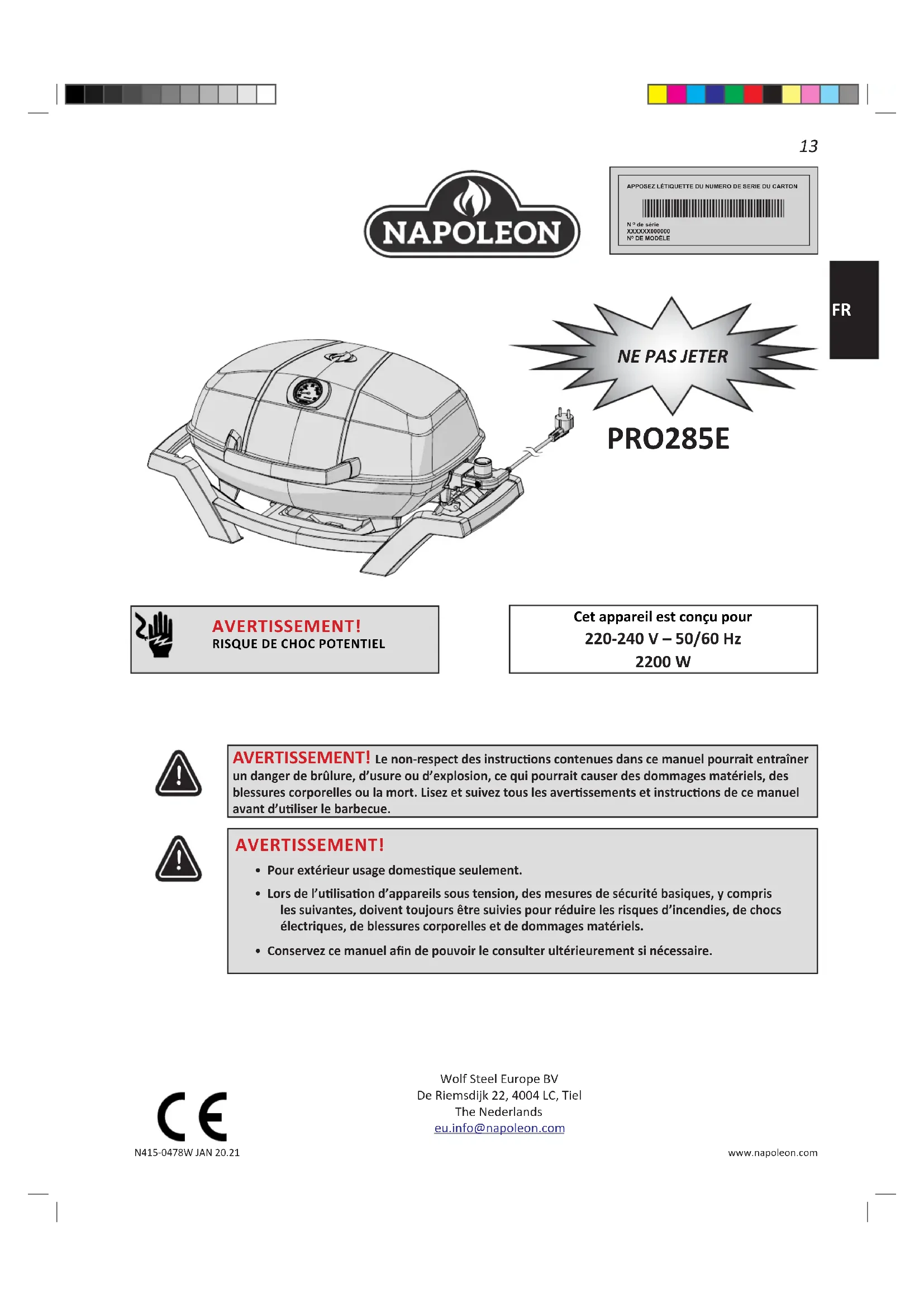 Wolf Steel Europe BVDe Riemsdijk 22, 4004 LC, TielThe Nederlandseu.info@napoleon.com AVERTISSEMENT! RISQUE DE CHOC POTENTIELCet appareil est conçu pour 220-240 V – 50/60 Hz 2200 W PRO285E AVERTISSEMENT! Le non-respect des instrucons contenues dans ce manuel pourrait entraîner un danger de brûlure, d’usure ou d’explosion, ce qui pourrait causer des dommages matériels, des blessures corporelles ou la mort. Lisez et suivez tous les averssements et instrucons de ce manuel avant d’uliser le barbecue. AVERTISSEMENT!