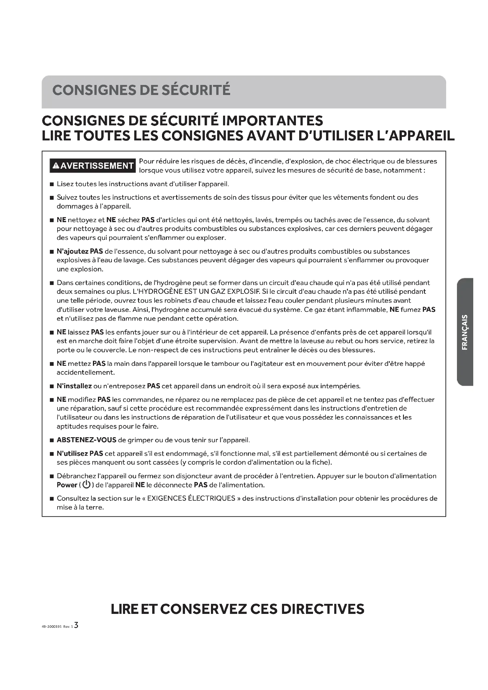 Pour réduire les risques de décès, d'incendie, d'explosion, de choc électrique ou de blessures lorsque vous utilisez votre appareil, suivez les mesures de sécurité de base, notamment : ʄ Lisez toutes les instructions avant d'utiliser l'appareil. ʄ Suivez toutes les instructions et avertissements de soin des tissus pour éviter que les vêtements fondent ou des dommages à l’appareil. ʄ NE nettoyez et NE séchez PA S d'articles qui ont été nettoyés, lavés, trempés ou tachés avec de l'essence, du solvant pour nettoyage à sec ou d'autres produits combustibles ou substances explosives, car ces derniers peuvent dégager des vapeurs qui pourraient s'enflammer ou exploser. ʄ N'ajoutez PA S de l'essence, du solvant pour nettoyage à sec ou d'autres produits combustibles ou substances explosives à l'eau de lavage. Ces substances peuvent dégager des vapeurs qui pourraient s'enflammer ou provoquer une explosion. ʄ Dans certaines conditions, de l'hydrogène peut se former dans un circuit d'eau chaude qui n'a pas été utilisé pendant deux semaines ou plus. L'HYDROGÈNE EST UN GAZ EXPLOSIF. Si le circuit d'eau chaude n'a pas été utilisé pendant une telle période, ouvrez tous les robinets d'eau chaude et laissez l'eau couler pendant plusieurs minutes avant d'utiliser votre laveuse. Ainsi, l'hydrogène accumulé sera évacué du système. Ce gaz étant inflammable, NE fumez PA S et n'utilisez pas de flamme nue pendant cette opération. ʄ NE laissez PAS les enfants jouer sur ou à l'intérieur de cet appareil. La présence d'enfants près de cet appareil lorsqu'il est en marche doit faire l'objet d'une étroite supervision. Avant de mettre la laveuse au rebut ou hors service, retirez la porte ou le couvercle. Le non-respect de ces instructions peut entraîner le décès ou des blessures. ʄ NE mettez PA S la main dans l'appareil lorsque le tambour ou l'agitateur est en mouvement pour éviter d'être happé accidentellement. ʄ N'installez ou n'entreposez PA S cet appareil dans un endroit où il sera exposé aux intempéries. ʄ NE modifiez PA S les commandes, ne réparez ou ne remplacez pas de pièce de cet appareil et ne tentez pas d'effectuer une réparation, sauf si cette procédure est recommandée expressément dans les instructions d'entretien de l'utilisateur ou dans les instructions de réparation de l'utilisateur et que vous possédez les connaissances et les aptitudes requises pour le faire. ʄ ABSTENEZ-VOUS de grimper ou de vous tenir sur l’appareil. ʄ N'utilisez PAS cet appareil s'il est endommagé, s'il fonctionne mal, s'il est partiellement démonté ou si certaines de ses pièces manquent ou sont cassées (y compris le cordon d'alimentation ou la fiche). ʄ Débranchez l'appareil ou fermez son disjoncteur avant de procéder à l'entretien. Appuyer sur le bouton d'alimentation Power ( ) de l'appareil NE le déconnecte PAS de l'alimentation. ʄ Consultez la section sur le « EXIGENCES ÉLECTRIQUES » des instructions d'installation pour obtenir les procédures de mise à la terre. AVERTISSEMENT4 49-3000191 Rev. 1 FRANÇAIS