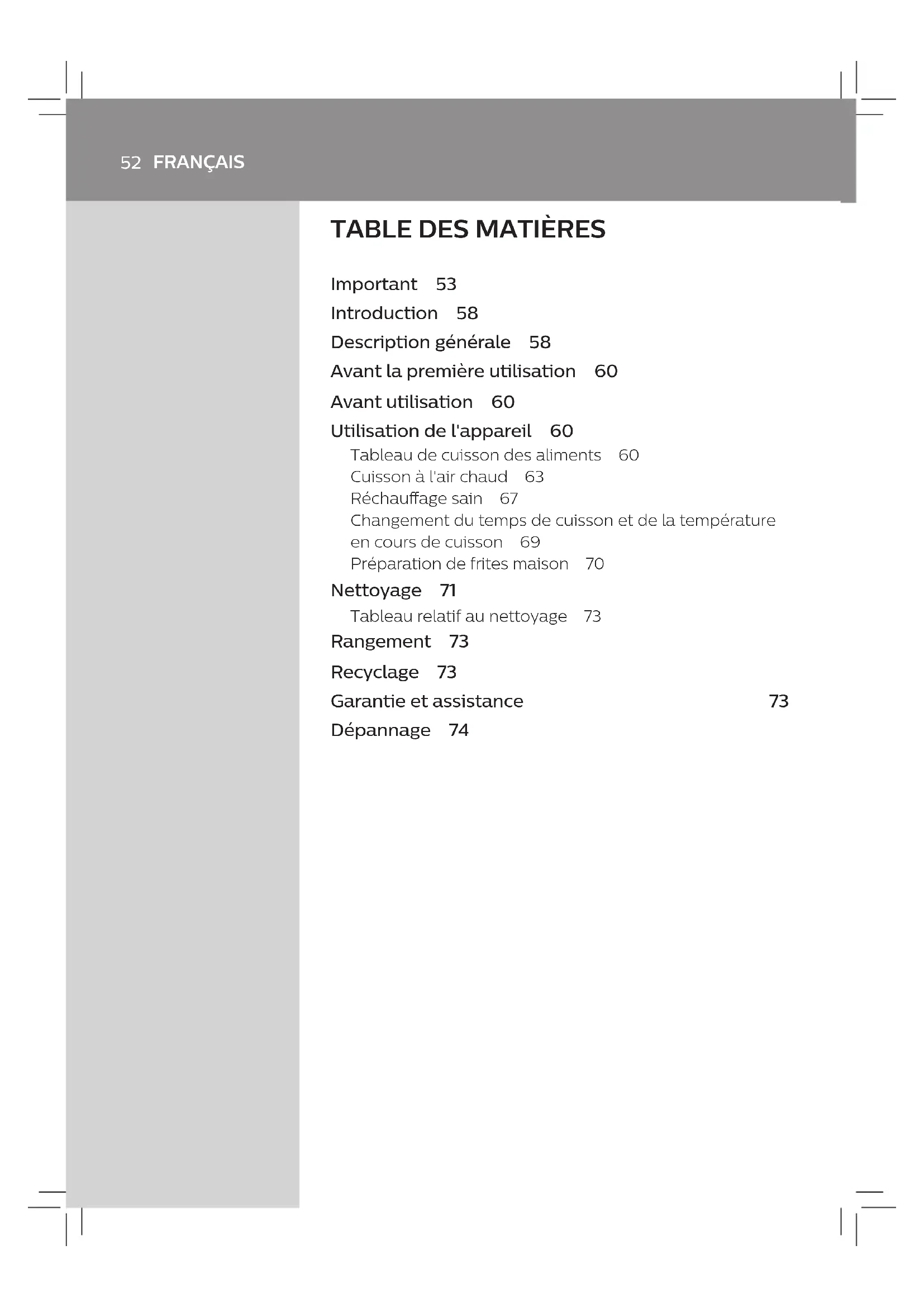 Important 53 Introduction 58 Description générale 58 Avant la première utilisation 60 Avant utilisation 60 Utilisation de l'appareil 60 Tableau de cuisson des aliments 60 Cuisson à l'air chaud 63 Réchauage sain 67 Changement du temps de cuisson et de la température en cours de cuisson 69 Préparation de frites maison 70 Nettoyage 71 Tableau relatif au nettoyage 73 Rangement 73 Recyclage 73 Garantie et assistance 73 Dépannage 7453 FRANÇAIS Important Lisez attentivement ces informations importantes avant d'utiliser l'appareil et conservez-les pour un usage ultérieur. Danger - Mettez toujours les aliments à frire dans le panier an d'éviter qu'ils entrent en contact avec les résistances. - Ne couvrez pas les entrées et sorties d'air pendant que l'appareil fonctionne. - Ne remplissez pas la cuve d'huile an d'éviter tout risque d'incendie. - Ne plongez jamais l'appareil dans l'eau, ni dans d'autres liquides et ne le rincez pas sous le robinet. - Veillez à ne pas faire pénétrer d'eau ou d'autres liquides dans l'appareil an d'éviter tout risque d'électrocution. - Veillez à ce que la quantité de nourriture utilisée ne dépasse le niveau maximal indiqué dans le panier. - Ne touchez jamais l'intérieur de l'appareil pendant qu'il fonctionne. Avertissement - Avant de brancher l'appareil, vériez que la tension indiquée sur l'appareil correspond à la tension supportée par le secteur local. - N'utilisez jamais l'appareil si la prise, le cordon d'alimentation ou l'appareil lui- même est endommagé. - Si le cordon d'alimentation est endommagé, il doit être remplacé par Philips, par un Centre Service Agréé Philips54 FRANÇAIS ou par un technicien qualié an d'éviter tout accident. - Cet appareil peut être utilisé par des enfants âgés de 8 ans ou plus, des personnes dont les capacités physiques, sensorielles ou intellectuelles sont réduites ou des personnes manquant d'expérience et de connaissances, à condition que ces enfants ou personnes soient sous surveillance ou qu'ils aient reçu des instructions quant à l'utilisation sécurisée de l'appareil et qu'ils aient pris connaissance des dangers encourus. Les enfants ne doivent pas jouer avec l'appareil. Le nettoyage et l'entretien ne doivent pas être réalisés par des enfants sauf s'ils sont âgés de plus de 8 ans et sous surveillance. - Tenez l'appareil et son cordon hors de portée des enfants de moins de 8 ans. - Tenez le cordon d'alimentation à l'écart des surfaces chaudes. - Branchez l'appareil uniquement sur une prise murale mise à la terre. Assurez-vous toujours que la che est correctement insérée dans la prise murale. - Cet appareil n'est pas destiné à être utilisé avec un minuteur externe ou un système de contrôle séparé. - Ne placez pas l'appareil contre un mur ou contre d'autres appareils. Laissez un espace libre d'au moins 10 cm à l'arrière et sur les côtés, et de 10 cm au-dessus de55 FRANÇAIS l'appareil. Ne placez jamais d'objets au- dessus de l'appareil. - N'utilisez pas l'appareil à d'autres ns que celles indiquées dans le mode d'emploi. - Lors de la cuisson à l'air chaud, de la vapeur brûlante s'échappe des sorties d'air. Gardez les mains et le visage à distance de la vapeur et des sorties d'air. Faites également attention à la vapeur chaude et à l'air chaud lorsque vous retirez la cuve de l'appareil. - Les surfaces accessibles peuvent chauer lorsque l'appareil fonctionne. - La cuve, le panier et les accessoires à l'intérieur de l'Airfryer deviennent chauds lors de l'utilisation. Soyez prudent(s) lorsque vous les manipulez. - Ne placez pas l'appareil sur ou à proximité d'une cuisinière chaude à gaz ou de tout type de cuisinière électrique ou de plaques de cuisson électriques, ou dans un four chaud. - N'utilisez jamais d'aliments légers ou du papier sulfurisé dans l'appareil. - Ne placez jamais l'appareil sur des matériaux combustibles, comme une nappe ou des rideaux, ou à proximité de ce type de matériaux. - Ne laissez jamais l'appareil fonctionner sans surveillance. - Débranchez tout de suite l'appareil si vous voyez de la fumée noire s'en échapper. Attendez que la fumée cesse pour sortir la cuve de l'appareil.56 FRANÇAIS - Conservation des pommes de terre : la température doit être adaptée à la variété des pommes de terre entreposées et doit être supérieure à 6°C pour minimiser le risque d'exposition à l'acrylamide dans les aliments préparés. - Ne branchez pas l'appareil et ne touchez pas au panneau de commande avec les mains humides. Attention - Cet appareil est destiné uniquement à un usage domestique normal. Il n'a pas été conçu pour une utilisation dans des environnements tels que des cuisines destinées aux employés dans les entreprises, magasins et autres environnements de travail. Il n'est pas non plus destiné à être utilisé par des clients dans des hôtels, motels, chambres d'hôtes et autres environnements résidentiels. - Conez toujours l'appareil à un Centre Service Agréé Philips pour réparation ou vérication. N'essayez jamais de réparer l'appareil vous-même ; toute intervention indue entraîne l'annulation de la garantie. - S'il est employé de manière inappropriée, à des ns professionnelles ou semi- professionnelles, ou en non-conformité avec les instructions du mode d'emploi, la garantie devient caduque et Philips décline toute responsabilité concernant les dégâts occasionnés.57 FRANÇAIS - Placez et utilisez toujours l'appareil sur une surface sèche, stable, plane et horizontale. - Débranchez toujours l'appareil après utilisation. - Laissez l'appareil refroidir pendant 30 minutes environ avant de le manipuler ou de le nettoyer. - Assurez-vous que les aliments cuits dans cet appareil sont dorés et pas bruns ou noirs. Enlevez les résidus brûlés. Ne faites pas frire les pommes de terre crues à une température supérieure à 180 °C (pour limiter la synthèse d'acrylamide). - Soyez pruden
