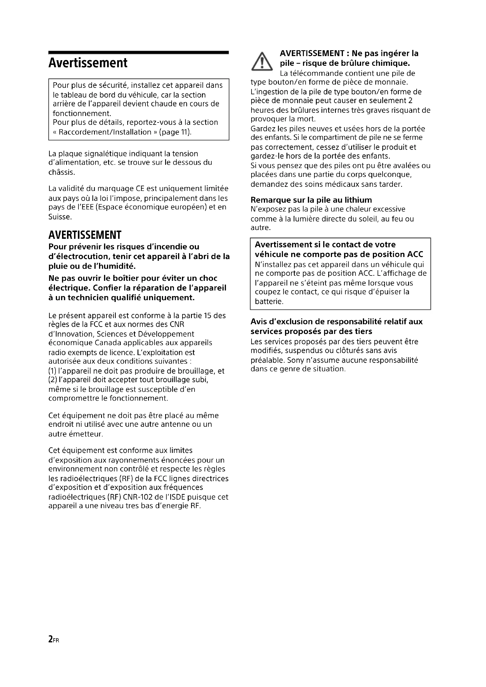 pile – risque de brûlure chimique. La télécommande contient une pile de type bouton/en forme de pièce de monnaie. L’ingestion de la pile de type bouton/en forme de pièce de monnaie peut causer en seulement 2 heures des brûlures internes très graves risquant de provoquer la mort. Gardez les piles neuves et usées hors de la portée des enfants. Si le compartiment de pile ne se ferme pas correctement, cessez d’utiliser le produit et gardez-le hors de la portée des enfants. Si vous pensez que des piles ont pu être avalées ou placées dans une partie du corps quelconque, demandez des soins médicaux sans tarder. Remarque sur la pile au lithium N’exposez pas la pile à une chaleur excessive comme à la lumière directe du soleil, au feu ou autre. Avis d’exclusion de responsabilité relatif aux services proposés par des tiers Les services proposés par des tiers peuvent être modifiés, suspendus ou clôturés sans avis préalable. Sony n’assume aucune responsabilité dans ce genre de situation. Pour plus de sécurité, installez cet appareil dans le tableau de bord du véhicule, car la section arrière de l’appareil devient chaude en cours de fonctionnement. Pour plus de détails, reportez-vous à la section « Raccordement/Installation » (page 11). Avertissement si le contact de votre véhicule ne comporte pas de position ACC N’installez pas cet appareil dans un véhicule qui ne comporte pas de position ACC. L’affichage de l’appareil ne s’éteint pas même lorsque vous coupez le contact, ce qui risque d’épuiser la batterie.3FR Mise en garde SONY NE PEUT EN AUCUN CAS ÊTRE TENU RESPONSABLE DE TOUT DOMMAGE DIRECT, INDIRECT OU CONSÉCUTIF OU DE TOUT AUTRE