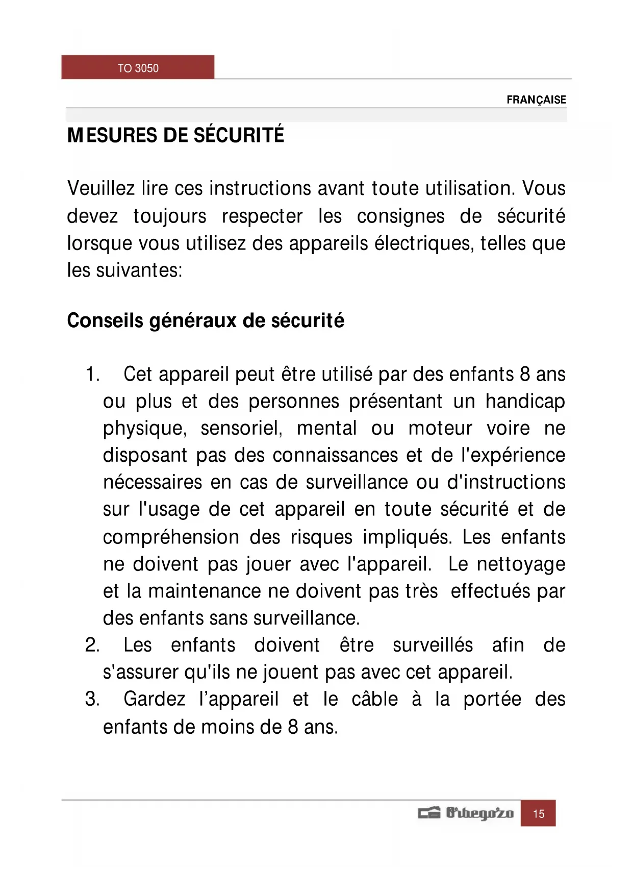 MODE D'EMPLOI TO 3050 Orbegozo