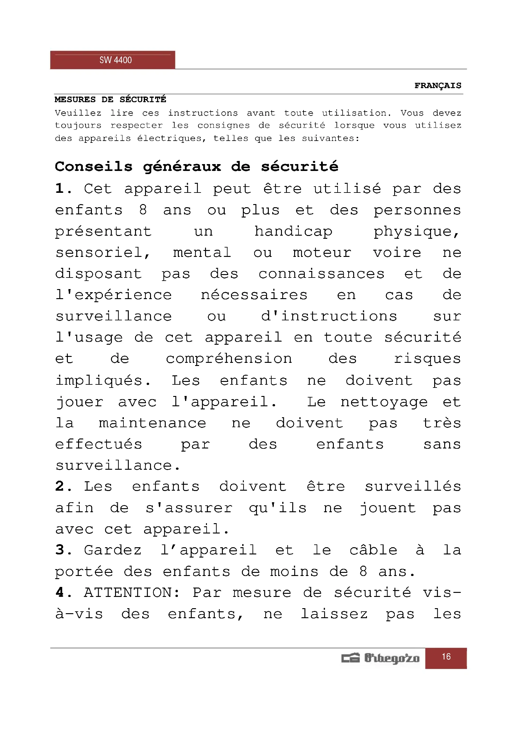 Retrouvez gratuitement la notice de l'appareil SW 4400 Orbegozo au format PDF.