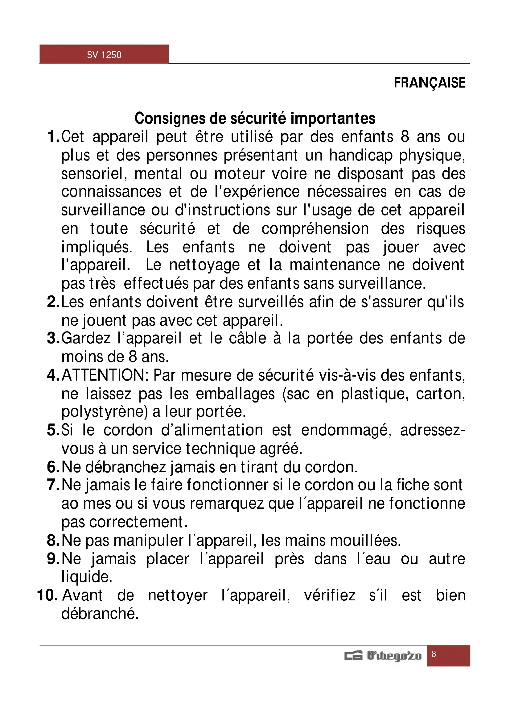 Retrouvez gratuitement la notice de l'appareil SV 1250 Orbegozo au format PDF.