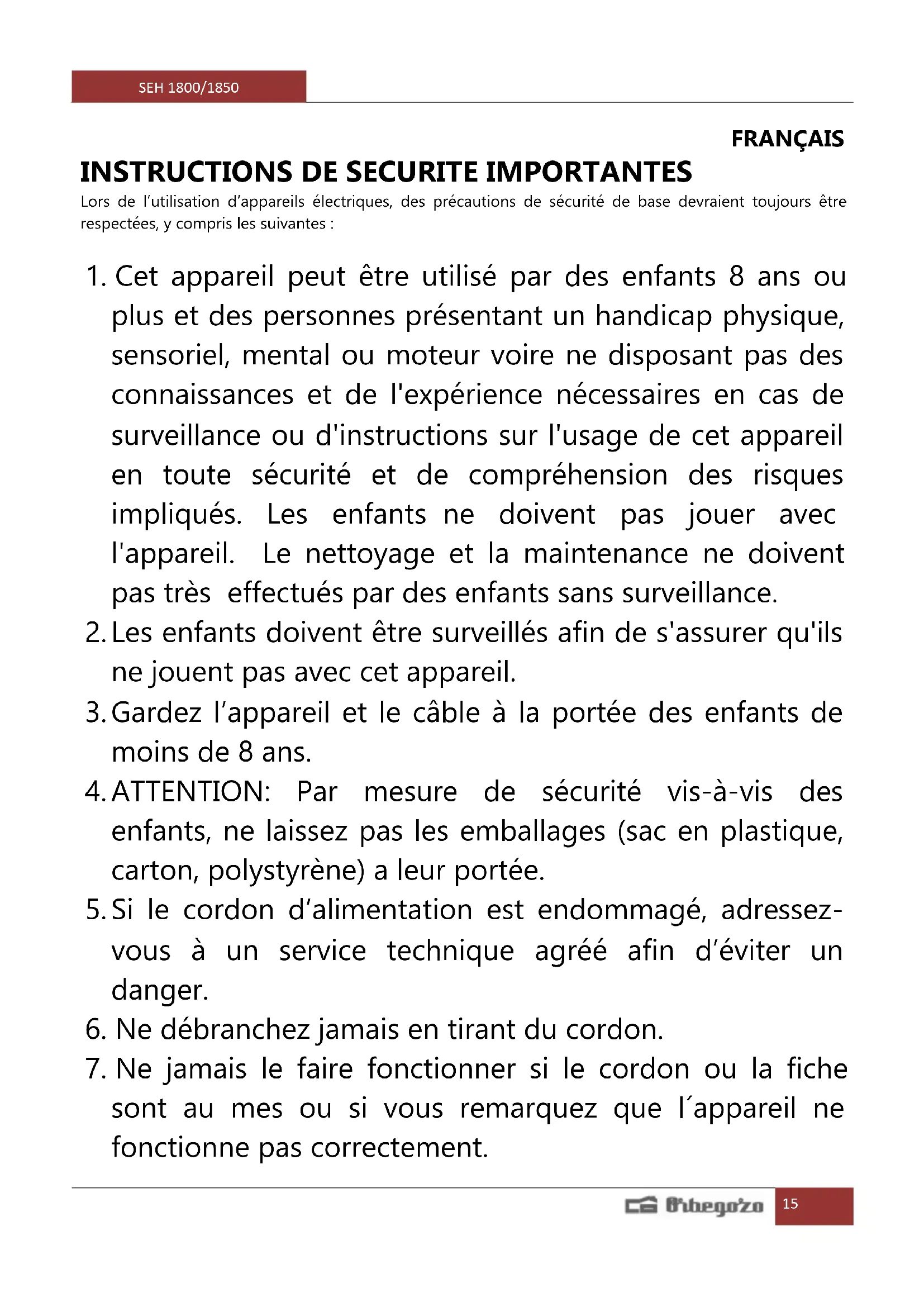 MODE D'EMPLOI SEH 1800 Orbegozo