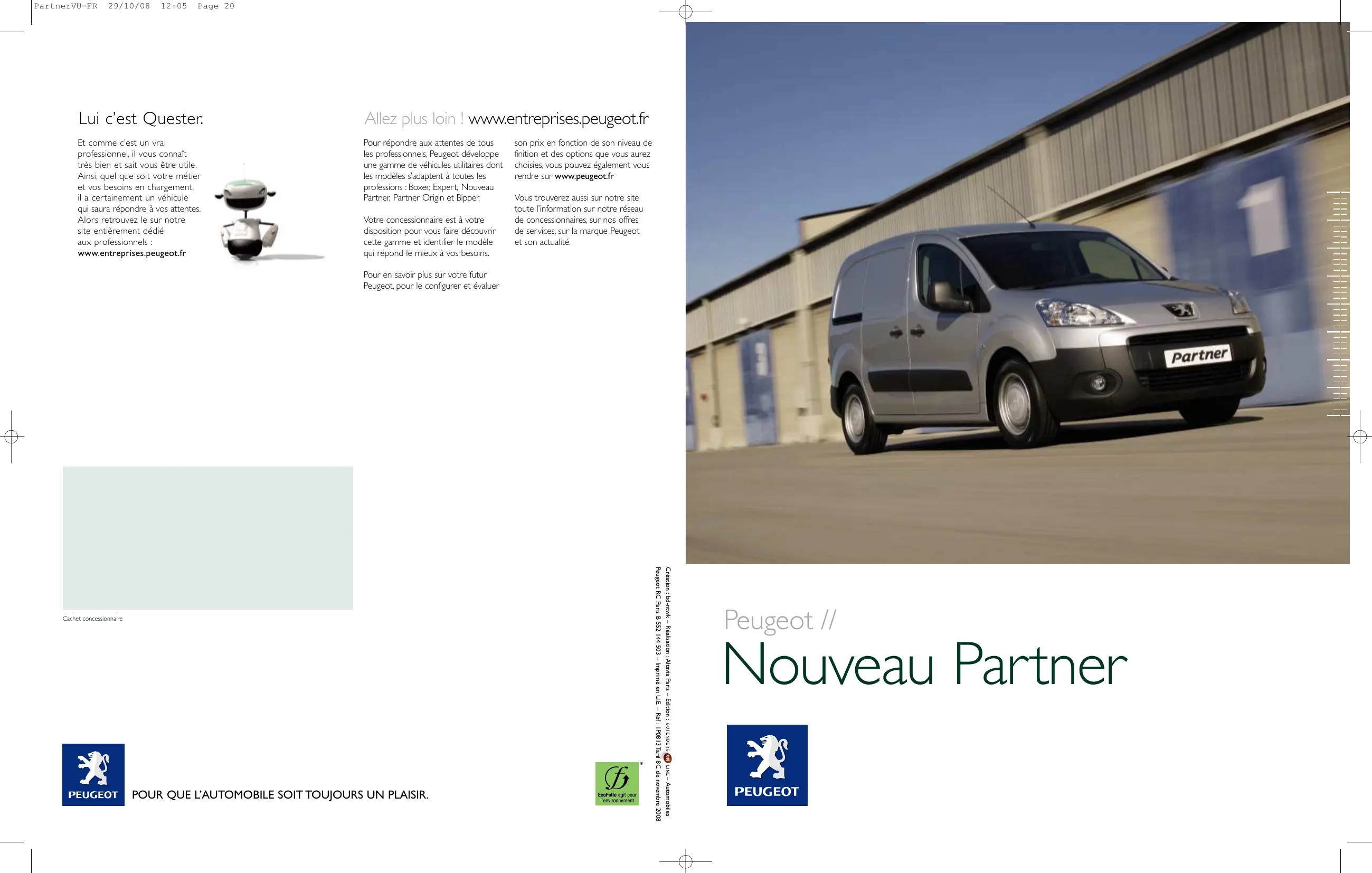 Pan PartnerVU-FR 29/10/08 12:05 Page 2 De professionnels à professionnels Quand vous choisissez Nouveau Partner vous choisissez plus qu'un simple utilitaire. Vous achetez une vision, celle d'une marque, Peugeot, attachée à satisfaire vos besoins spécifiques, à répondre à toutes vos attentes. Et vous achetez l'expression de cette vision : un véhicule totalement inédit, conçu pour vous permettre de vivre, chaque jour, avec intensité, votre activité professionnelle. Cette vision repose sur cinq grands atouts constituant autant de bénéfices d'usage : capacité de chargement, modularité, agrément de conduite, style équilibré et dynamique, coûts d'utilisation optimisés. PEUGEOT La capacité de chargement : Nouveau Partner offre un espace de chargement d'excellente capacité, bien accessible. En version courte, son volume utile de 3,3 à 3,7* m° (37 à 4,1* m° en version longue) et sa charge utile de 625 à 850 kg** qui sont parmi les meilleurs du marché, vous apporteront le rendement et l'efficacité que vous attendez de votre fourgonnette. La modularité : avec l'innovante banquette Muti-Flex, Nouveau Partner dispose d'un équipement qui lui permet d'offrir encore plus de modularité et de capacité de chargement, pour une plus grande fonctionnalité. L'agrément de conduite : avec son poste de conduite ergonomique et ses nombreux rangements, Nouveau Partner vous facilite la vie. Très agréable à conduire, i bénéficie de la qualité et des avancées technologiques des motorisations Peugeot. Le style :le design original de Nouveau Partner change et opte délibérement pour la séduction et l'attractivité. Il dégage aussi une forte impression de dynamisme et de robustesse, à l'image de l'entreprise qu'il représente. Les coûts d'utilisation : ils sont largement optimisés grâce à des motorisations économiques et une solidité à toute épreuve Toutes ces qualités sont celles d'un authentique professionnel, toujours prêt et disponible pour accomplir toutes les tâches. Voilà pourquoi l'entente entre vous et votre Nouveau Partner, de professionnel à professionnel, sera parfaite.