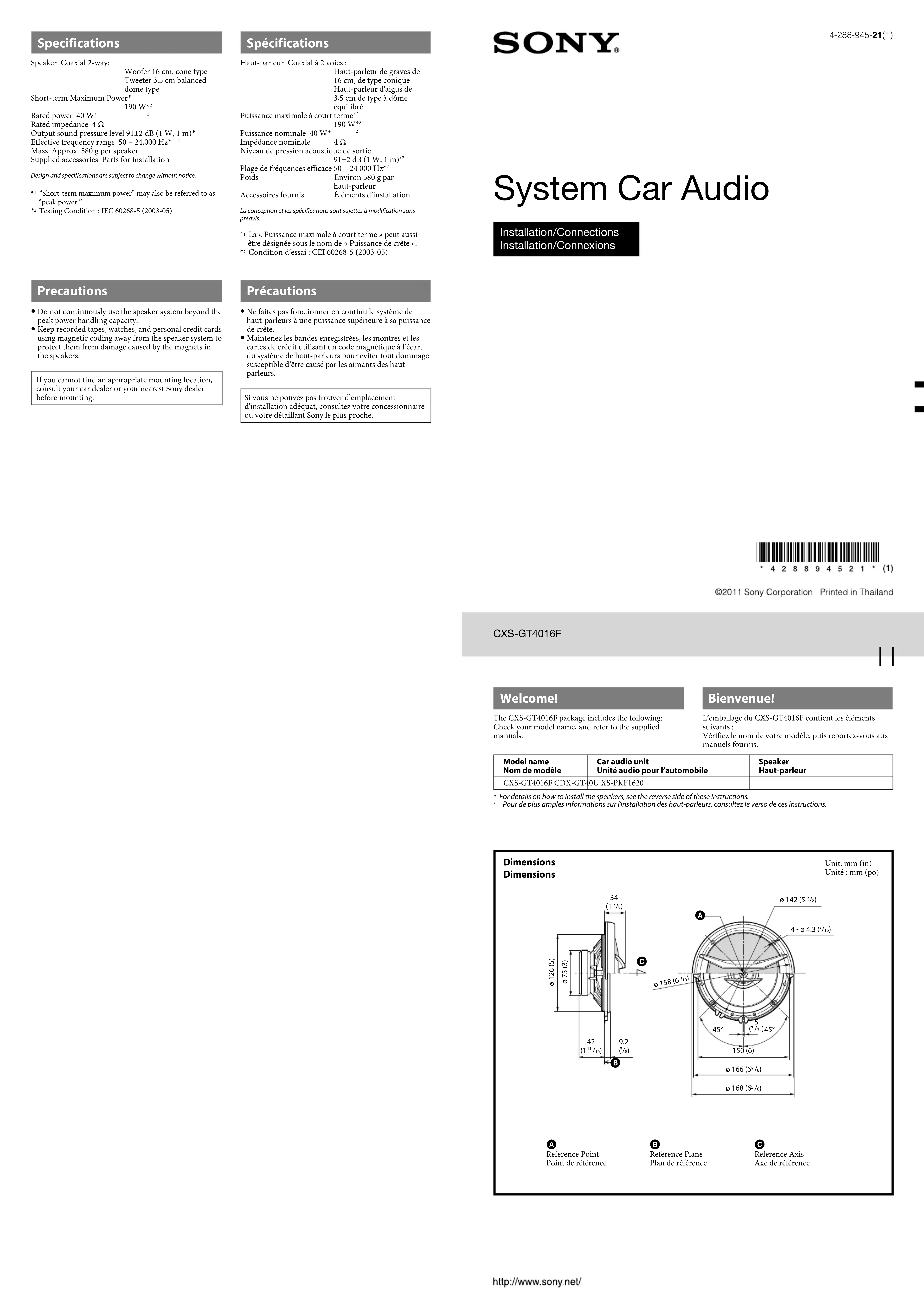 Maintenez les bandes enregistrées, les montres et les cartes de crédit utilisant un code magnétique à l’écart du système de haut-parleurs pour éviter tout dommage susceptible d’être causé par les aimants des haut-parleurs.Si vous ne pouvez pas trouver d’emplacement d'installation adéquat, consultez votre concessionnaire ou votre détaillant Sony le plus proche.Mounting/Montage Before mounting A depth of at least 42 mm (1 /16 in) is required for flush mounting. Measure the depth of the area where you are to mount the speaker, and ensure that the speaker is not obstructing any other components of the car. Keep the followings in mind when choosing a mounting location: Make sure that nothing is obstructing around the mounting location of the door (front or rear) or the rear tray where you are to mount the speaker. A hole for mounting may already be cut out of the inner panel of the door (front or rear) or the rear tray. In this case, you need to modify the board only. If you are to mount this speaker system in the door (front or rear), make sure that the speaker terminals, frame or magnet do not interfere with any inner parts, such as the window mechanism in the door (when you open or close the window), etc. Also make sure that the speaker grille does not touch any inner fittings, such as the window cranks, door handles, arm rests, door pockets, lamps or seats etc. If you are to mount this speaker system in the rear tray, make sure that the speaker terminals, frame or magnet do not touch any inner parts of the car, such as the torsion bar springs (when you open or close the trunk (boot) lid), etc. Also make sure that the speaker grille does not touch any inner fittings, such as seat belts, head rests, center brake lights, inner covers of the rear wipers, curtains or air purifiers, etc. Avant le montage Une profondeur d’au moins 42 mm (1 /16 po) est nécessaire pour effectuer le montage encastré. Mesurez la profondeur de l’emplacement où vous souhaitez monter le haut-parleur et assurez-vous que ce dernier ne gêne en rien les autres composants du véhicule. Prenez les points suivants en considération lors du choix de l’emplacement de montage : Assurez-vous qu’aucun objet ne fait obstacle à proximité de l’emplacement de montage sur la portière (avant ou arrière) ou sur la plage arrière où vous envisagez de monter le haut-parleur. Il est possible qu’un trou ait déjà été découpé dans le panneau intérieur de la portière (avant ou arrière) ou de la plage arrière. Dans ce cas, il vous suffit de modifier le panneau. Si vous envisagez de monter ce système de haut-parleurs sur la portière (avant ou arrière), assurez-vous que les bornes, le cadre ou l'aimant du haut-parleur ne sont pas en contact avec des pièces internes, telles que le mécanisme de la vitre de la portière (lorsque vous ouvrez ou fermez la vitre), etc. Assurez-vous également que la grille du haut-parleur n’entre pas en contact avec des éléments internes, tels que les manivelles de lève-vitre, les poignées de portières, les accoudoirs, les vide-poches, les lampes ou les sièges, etc. Si vous envisagez de monter ce système de haut-parleurs sur la plage arrière, assurez-vous que les bornes, le cadre ou l'aimant du haut-parleur n’entrent pas en contact avec des pièces internes du véhicule, telles que les ressorts à barre de torsion (lorsque vous ouvrez ou fermez le coffre), etc. Assurez-vous également que la grille du haut-parleur n’entre pas en contact avec des éléments internes, tels que ceintures de sécurité, appuie-têtes, feux de stop centraux, garnitures intérieures des essuie-glaces arrière, rideaux ou filtres à air, etc.× 2× 8 Parts list Liste des pièces
