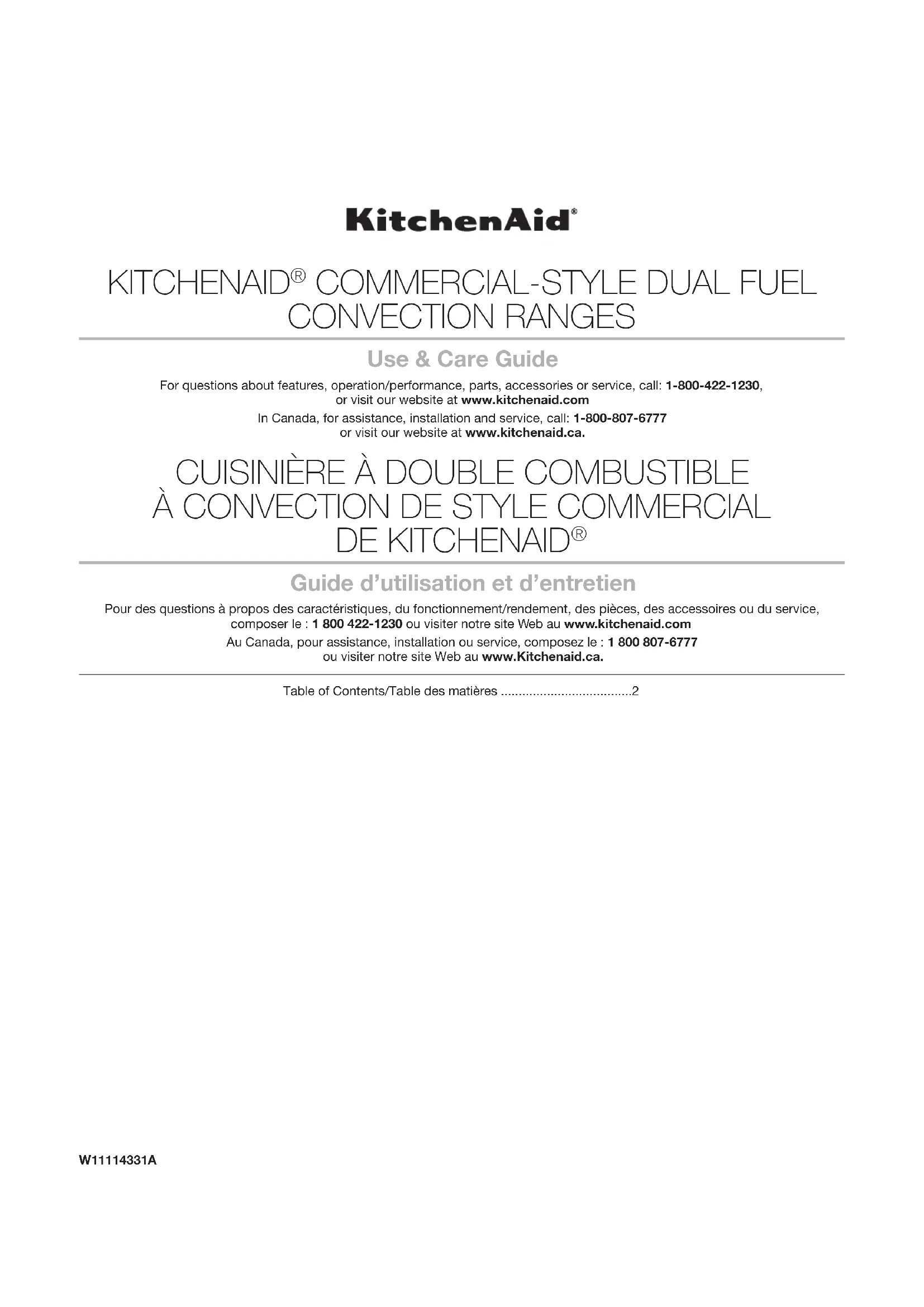 - Guide d’utilisation et d’entretien Pour des questions à propos des caractéristiques, du fonctionnement/rendement, des pièces, des accessoires ou du service, composer le: 1800422-1230 ou visiter notre site Web au www.kitchenaid.com Au Canada, pour assistance, installation ou service, composez le: 1800807-6777 ou visiter notre site Web au www.Kitchenaid.ca. Table of Contents/Table des matières p. 2