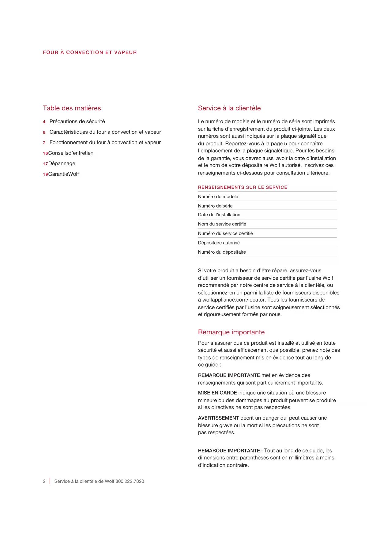 Numéro de modèle Numéro de série Date de l’installation Nom du service certié Numéro du service certié Dépositaire autorisé Numéro du dépositaire Si votre produit a besoin d’être réparé, assurez-vous d’utiliser un fournisseur de service certié par l’usine Wolf recommandé par notre centre de service à la clientèle, ou sélectionnez-en un parmi la liste de fournisseurs disponibles à wolfappliance.com/locator. Tous les fournisseurs de service certiés par l’usine sont soigneusement sélectionnés et rigoureusement formés par nous. Remarque importante Pour s’assurer que ce produit est installé et utilisé en toute sécurité et aussi efcacement que possible, prenez note des types de renseignement mis en évidence tout au long de ce guide : REMARQUE IMPORTANTE met en évidence des renseignements qui sont particulièrement importants. MISE EN GARDE indique une situation où une blessure mineure ou des dommages au produit peuvent se produire si les directives ne sont pas respectées. AVERTISSEMENT décrit un danger qui peut causer une blessure grave ou la mort si les précautions ne sont pas respectées. REMARQUE IMPORTANTE : Tout au long de ce guide, les dimensions entre parenthèses sont en millimètres à moins d’indication contraire. Table des matières 4 Précautions de sécurité6 Caractéristiques du four à convection et vapeur7 Fonctionnement du four à convection et vapeur16 Conseils d’entretien17 Dépannage19 Garantie Wolfwolfappliance.com