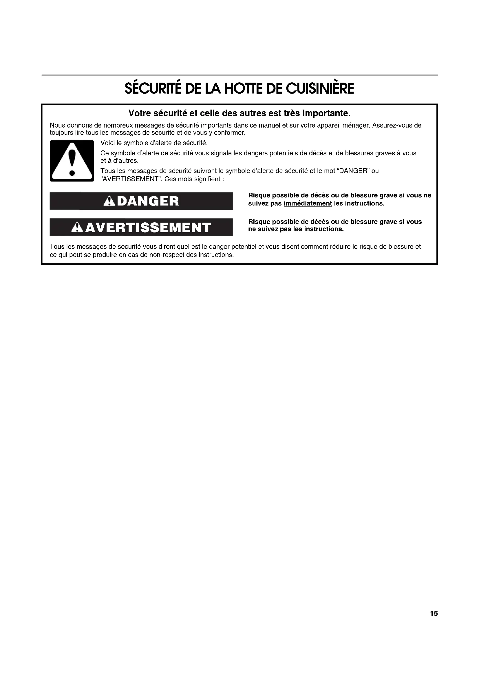 SUIVANTES : ■ Utiliser cet appareil uniquement dans les applications envisagées par le fabricant. Pour toute question, contacter le fabricant. ■ Avant d'entreprendre un travail d'entretien ou de nettoyage, interrompre l'alimentation de la hotte au niveau du tableau de disjoncteurs, et verrouiller le tableau de disjoncteurs pour empêcher tout rétablissement accidentel de l'alimentation du circuit. Lorsqu'il n'est pas possible de verrouiller le tableau de disjoncteurs, placer sur le tableau de disjoncteurs une étiquette d'avertissement proéminente interdisant le rétablissement de l'alimentation. ■ Tout travail d'installation ou câblage électrique doit être réalisé par une personne qualifiée, dans le respect des prescriptions de tous les codes et normes applicables, y compris les codes du bâtiment et de protection contre les incendies. ■ Ne pas faire fonctionner un ventilateur dont le cordon ou la fiche est endommagé(e). Jeter le ventilateur ou le retourner à un centre de service agréé pour examen et/ou réparation. ■ Une source d'air de débit suffisant est nécessaire pour le fonctionnement correct de tout appareil à gaz (combustion et évacuation des gaz à combustion par la cheminée), pour qu'il n'y ait pas de reflux des gaz de combustion. Respecter les directives du fabricant de l'équipement de chauffage et les prescriptions des normes de sécurité - comme celles publiées par la National Fire Protection Association (NFPA) et l'American Society for Heating, Refrigeration and Air Conditioning Engineers (ASHRAE), et les prescriptions des autorités réglementaires locales. ■ Lors d'opérations de découpage et de perçage dans un mur ou un plafond, veiller à ne pas endommager les câblages électriques ou canalisations qui peuvent s'y trouver. ■ Les ventilateurs d'évacuation doivent toujours décharger l'air à l'extérieur. MISE EN GARDE : Cet appareil est conçu uniquement pour la ventilation générale. Ne pas l'utiliser pour l'extraction de matières ou vapeurs dangereuses ou explosives. MISE EN GARDE : Pour minimiser le risque d'incendie et évacuer adéquatement les gaz, veiller à acheminer l'air aspiré par un conduit jusqu'à l'extérieur - ne pas décharger l'air aspiré dans un espace vide du bâtiment comme une cavité murale, un plafond, un grenier, un vide sanitaire ou un garage.