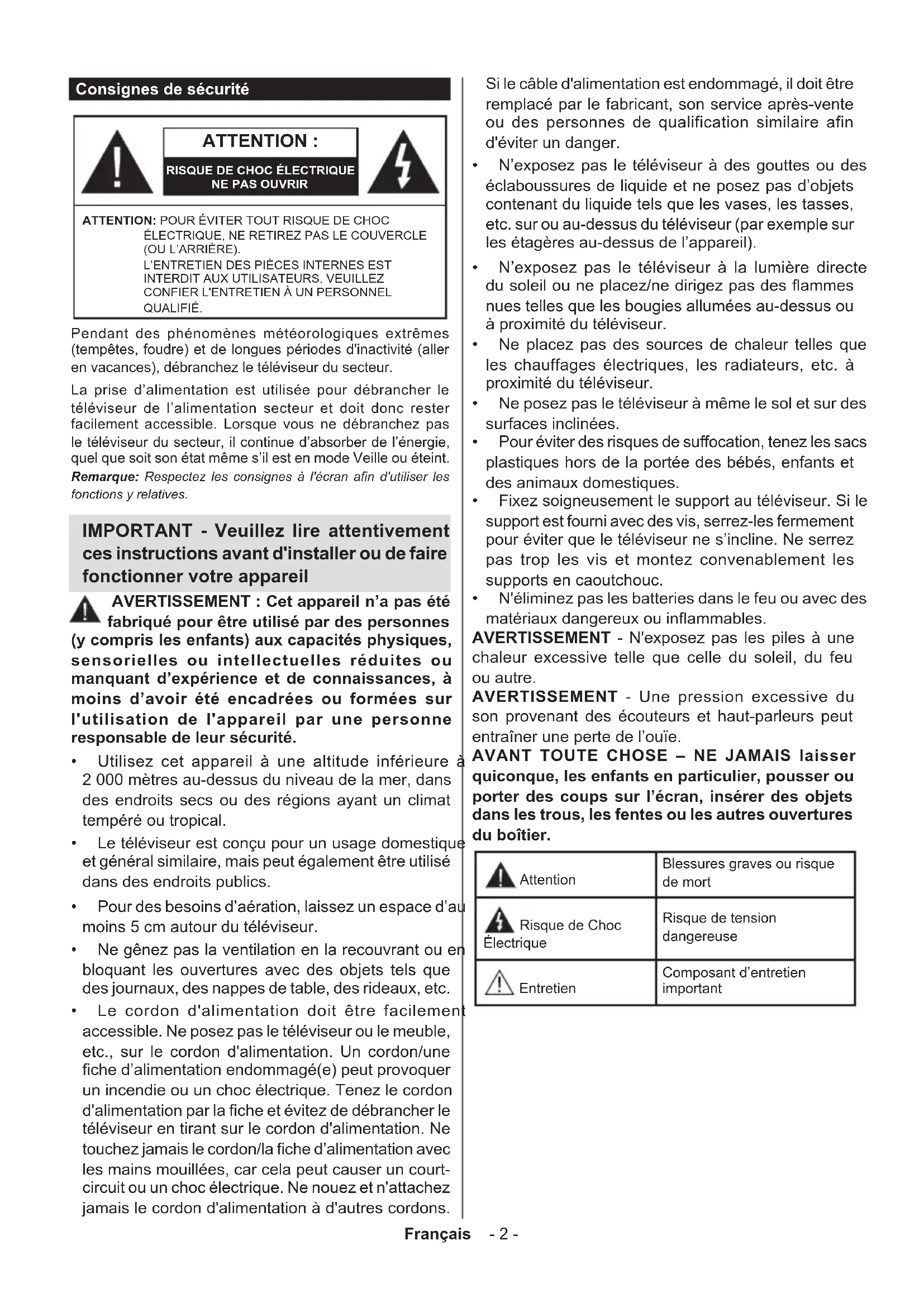 Mise en garde, voir instructions d'utilisation : Les zones marquées contiennent des piles en forme de bouton ou de pièce de monnaie remplaçables par l'utilisateur. CLASS 1 LASER PRODUCT Produit Laser de Classe 1 : Ce produit est équipé d’une source laser de Classe 1 sans danger dans des conditions d’utilisation raisonnablement prévisibles. AVERTISSEMENT N'avalez pas la pile. Les produits chimiques y contenus pourraient vous brûler. Ce produit ou les accessoires fournis avec celui-ci pourraient contenir une pile bouton. L'ingestion d'une pile bouton peut causer non seulement de sévères brûlures internes en seulement 2 heures, mais aussi le décès. Gardez les nouvelles et anciennes piles hors de portée des enfants. Si le compartiment à piles ne se ferme pas correctement, arrêtez d'utiliser le produit et tenez-le hors de la portée des enfants. Si vous pensez que des piles ont été avalées ou logées n’importe où à l’intérieur du corps, consultez de toute urgence un médecin. – – – – – – – – – – – – Ne posez jamais un téléviseur sur un support instable ou incliné. Le téléviseur pourrait chuter, et provoquer de graves blessures corporelles, voire la mort. Vous pouvez éviter de nombreuses blessures, notamment aux enfants, en prenant des précautions simples telles que :
